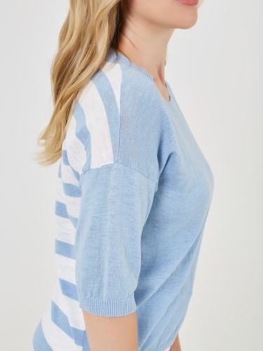 Джемпер выполнен в мягких голубых оттенках с полосатой спиной, что придаёт ему свежий и летний вид. Модель с коротким рукавом и лёгким палантином идеально подходит для уютных вечеров и комбинируется с различной одеждой. Коллекция Весна-Лето 2025. Капсула "Санторини". Параметры модели: 89-70-92, рост 167, размер 44-46