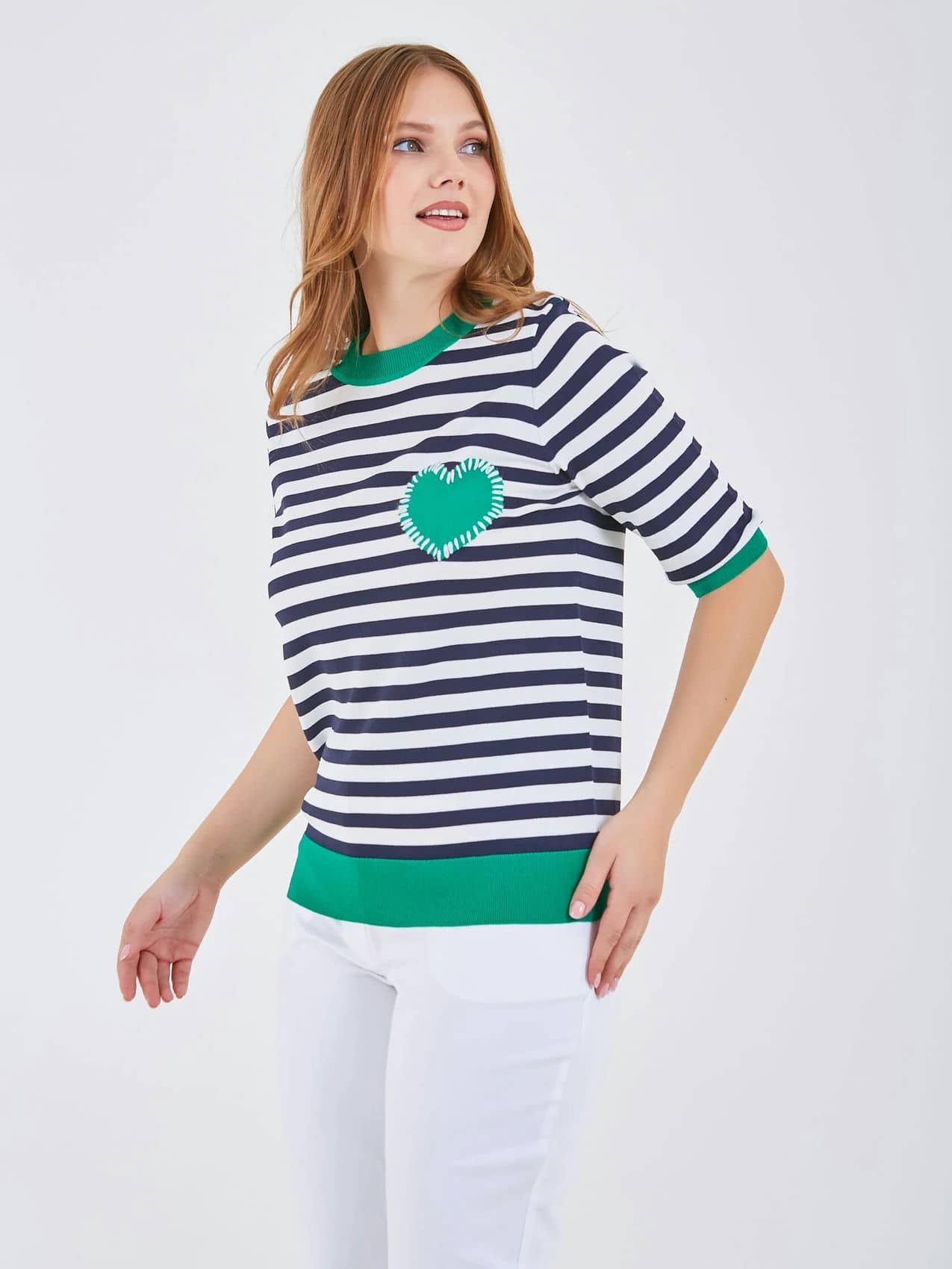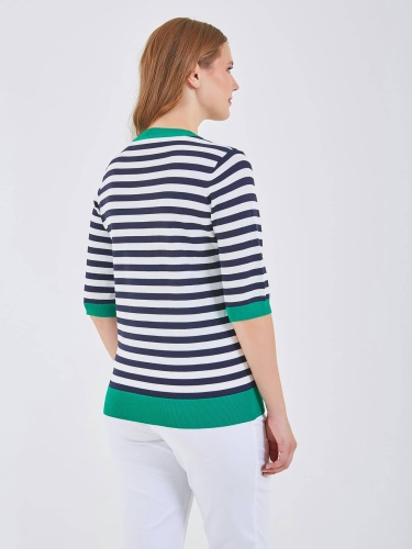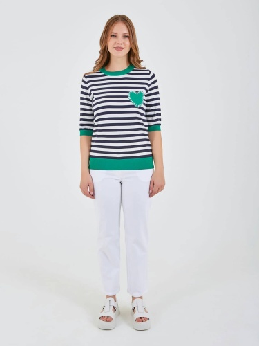 Джемпер имеет полосатый рисунок в черно-белых тонах с ярким зеленым воротником и акцентом в форме сердца. Свободный крой и короткие рукава обеспечивают комфорт, идеально подходя для повседневного носки. Коллекция Весна-Лето 2025. Капсула "Марракеш". Параметры модели: 95-64-101, рост 175, размер 44-46