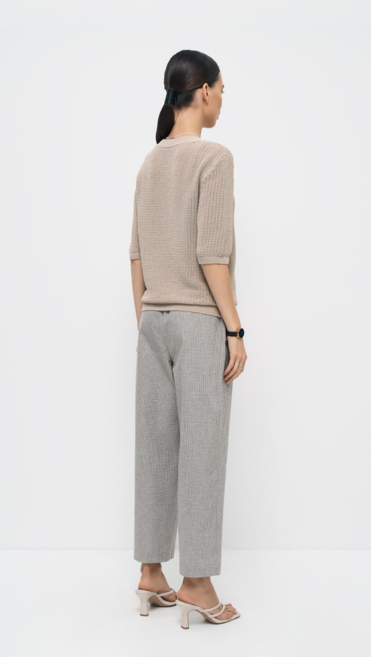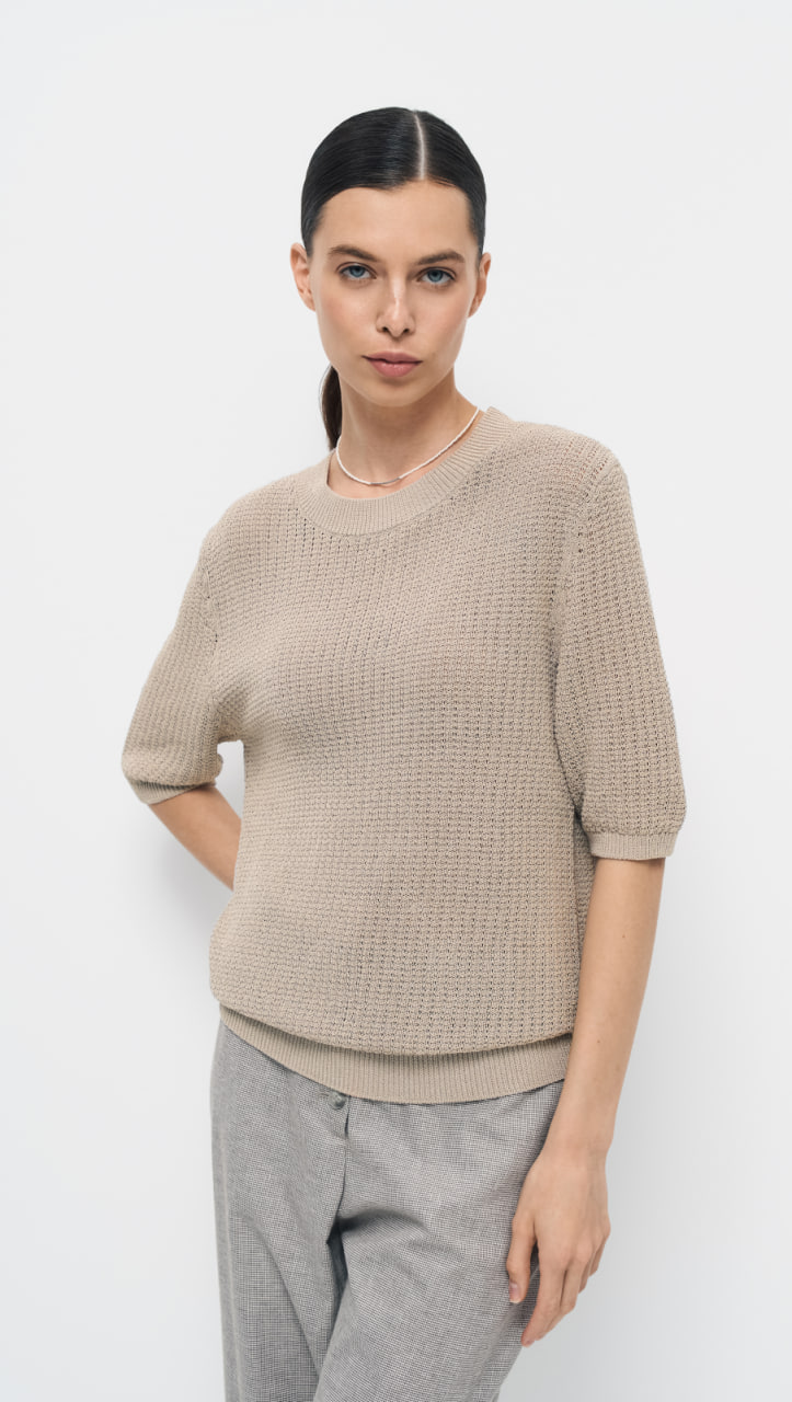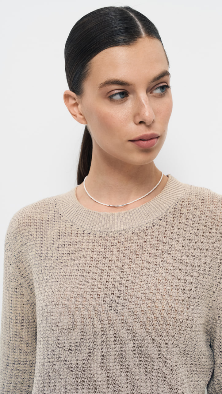 Пуловер О-образного силуэта выполнен в технике ажурной вязки шнуром. Используемая пряжа придаёт изделию особый глянцевый деликатный блеск, который привлекает внимание и придаёт элегантность, а ажурная вязка, выполненная шнуром, создаёт кольчужный эффект, делая пуловер уникальным и стильным.