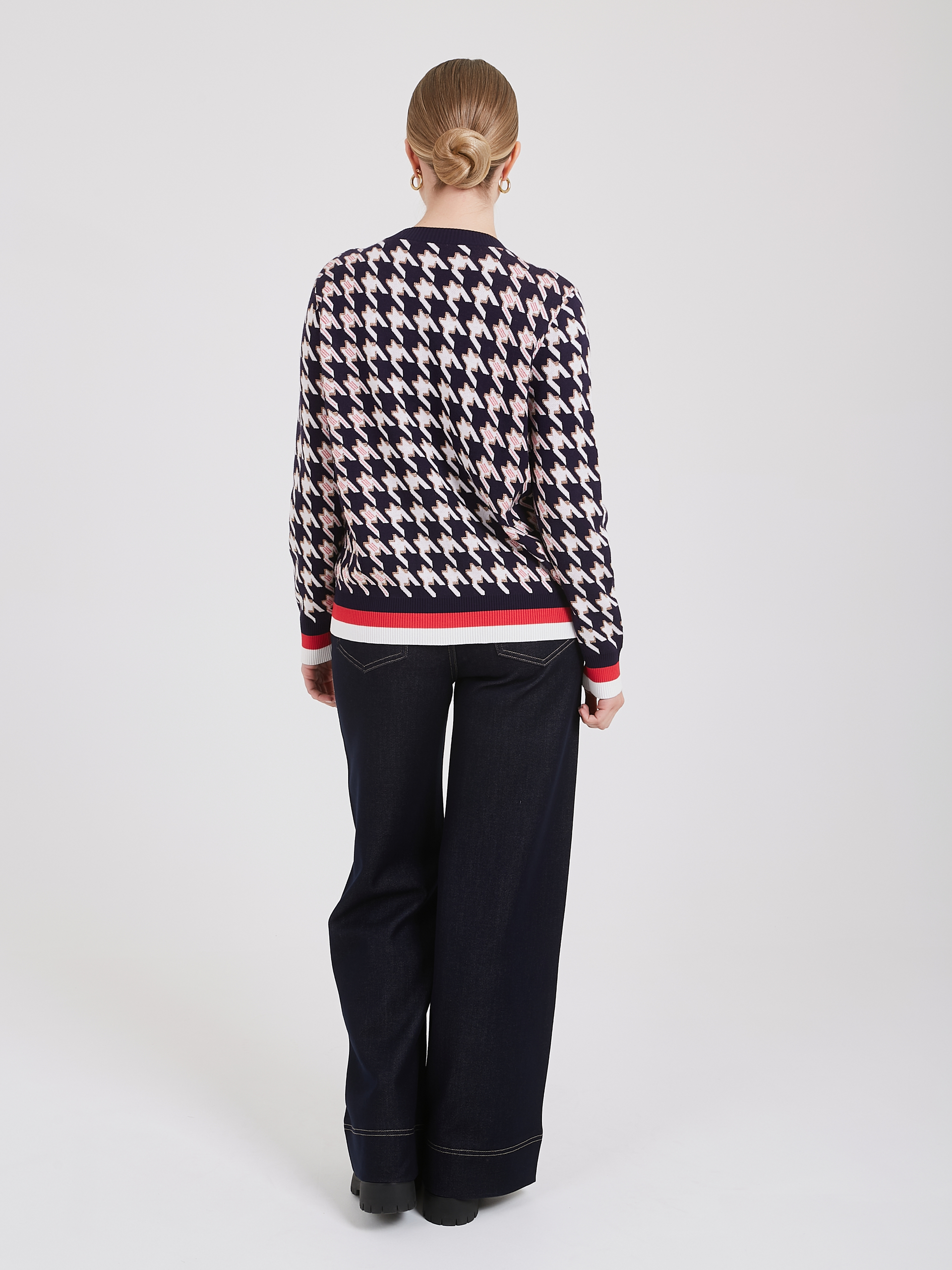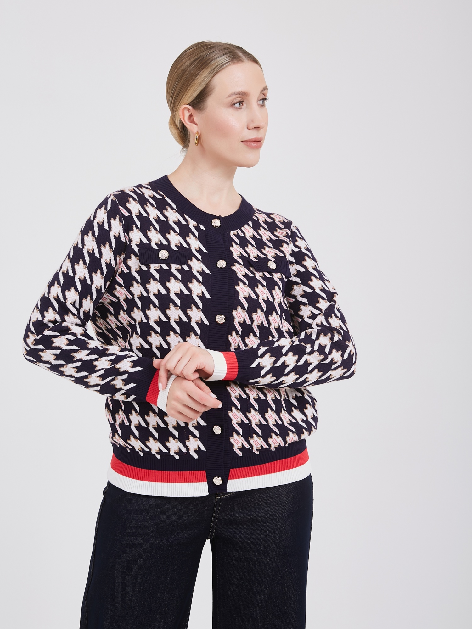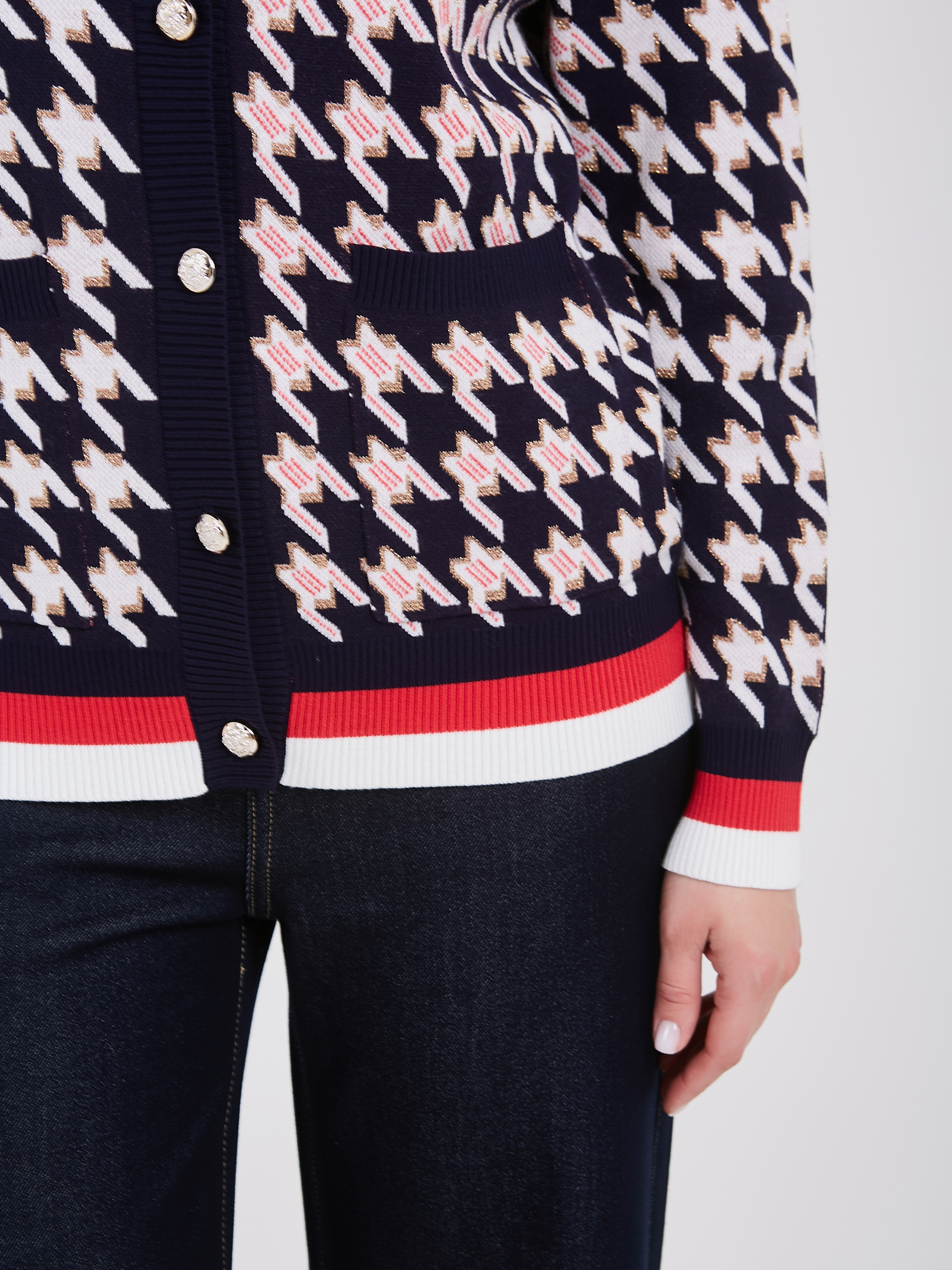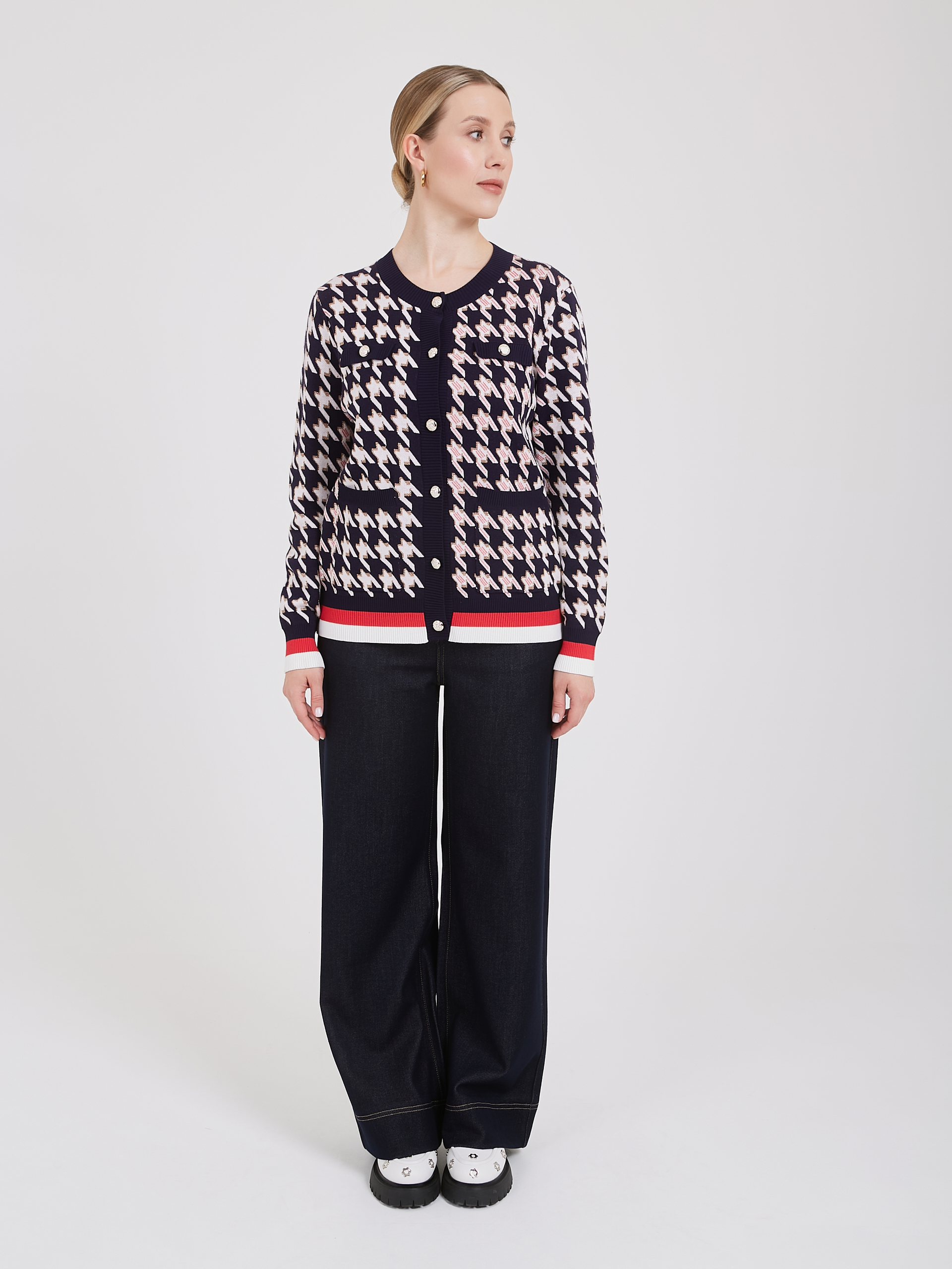 Темно-синий кардиган с узором "гусиная лапка" белого и розового цветов сочетает в себе классический стиль и современный дизайн. Застежка на несколько светлых пуговиц добавляет элегантности, а нижняя часть кардигана с белой и красной полоской создает яркий акцент. Такой кардиган станет универсальным выбором для создания любых образов. Осень-Зима'25/26. Капсула "Алые Паруса"