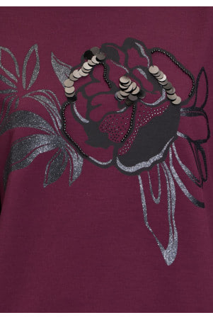 Эта бордовая толстовка идеально объединяет уют и современный стиль. Рукава длиной 3/4 придают особый шарм, а крупный принт цветка в оттенках серого и чёрного добавляет элегантности. Отделка из блесток создаёт эффект лёгкого мерцания, делая этот предмет гардероба одновременно привлекательным и функциональным выбором для создания интересных и актуальных образов.
