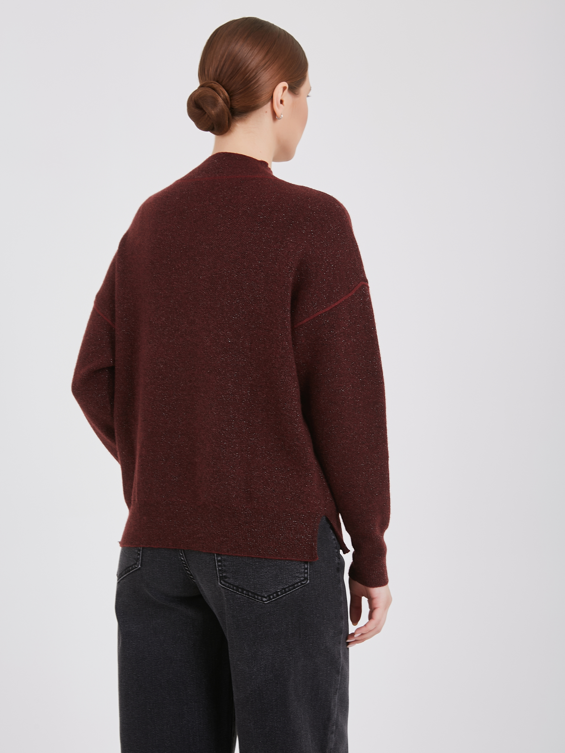 Бордовый свитер с высоким воротником и длинными рукавами. Элегантный образ подчеркивает выразительный вертикальный шов спереди. Свитер дарит ощущение комфорта и тепла в холодную погоду.Осень-Зима'25/26. Капсула "Вишневый сад"