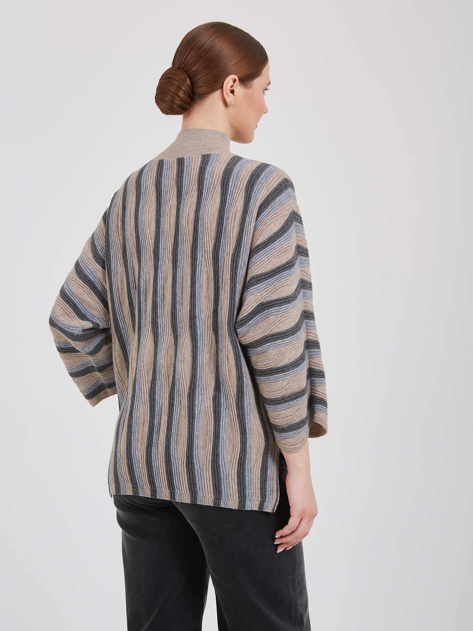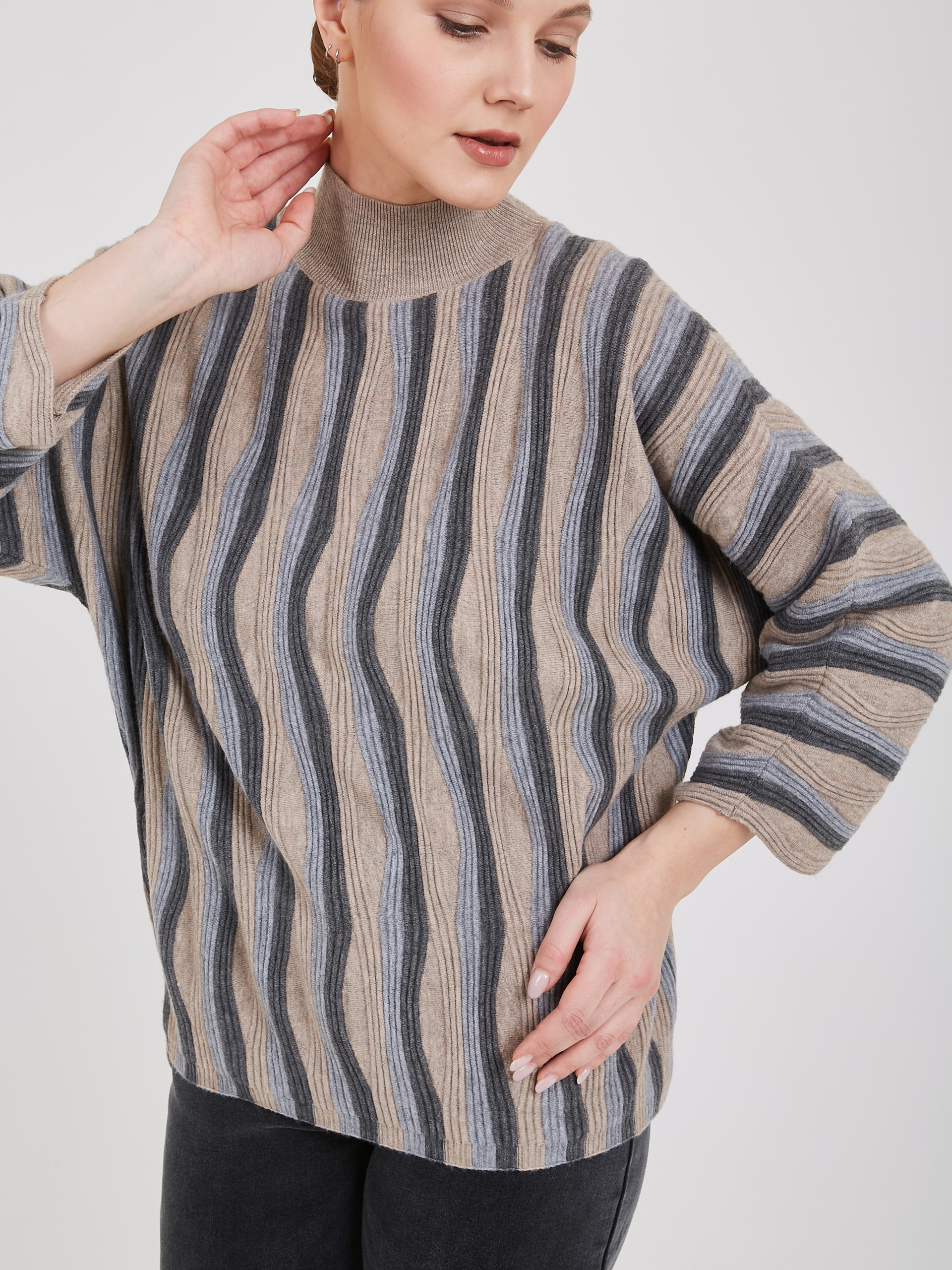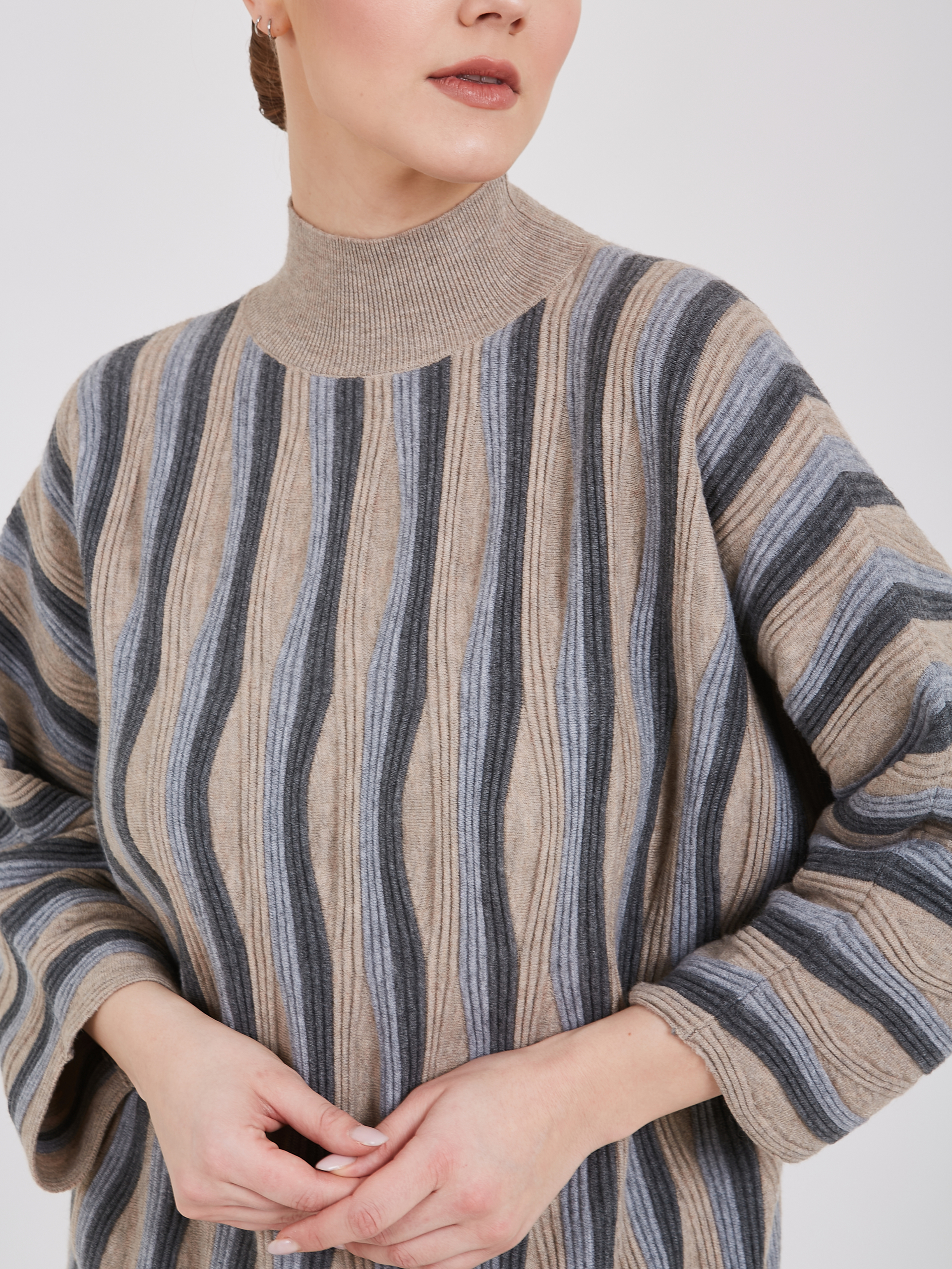 Женский свитер свободного кроя с высоким воротником, украшенный вертикальной полоской трех разных оттенков: бежевого, серого и светло-голубого. Рукава длиной три четверти добавляют особый шарм и современность облику. Осень-Зима'25/26. Капсула "Вишневый сад"