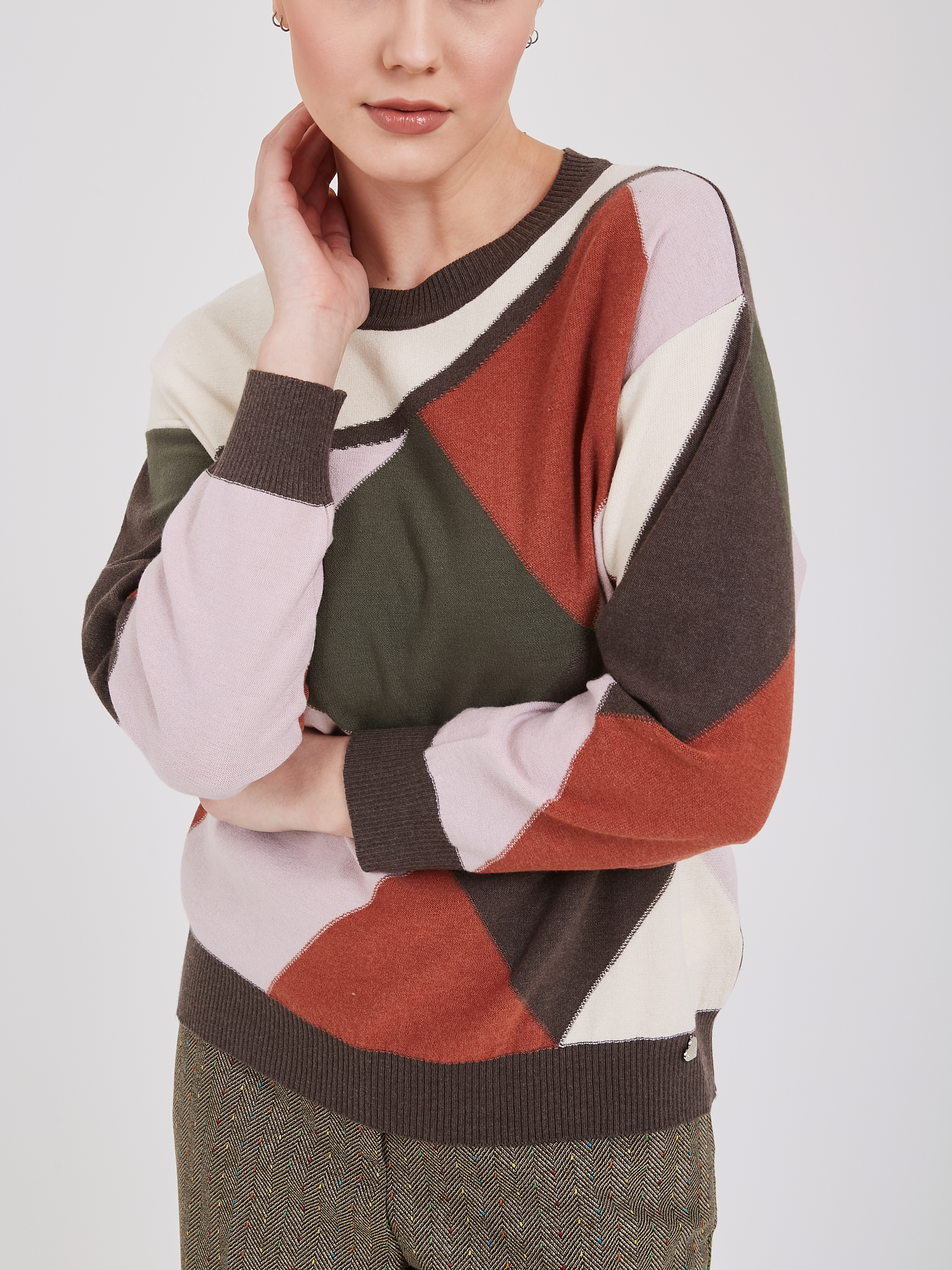 Свитер с выразительным геометрическим узором из коллекции известного бренда. Многоцветная палитра включает благородные оттенки коричневого, оливкового, нежного розового и теплого кремового цветов. Круглый ворот подчеркивает линию шеи, а длинные рукава обеспечивают комфорт и тепло. Осень-Зима'25/26. Капсула "Хозяйка медной горы"