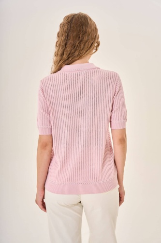 Розовая вязаная рубашка-поло с короткими рукавами. Классический воротник и три декоративные пуговицы придают ей нотку элегантности. Два небольших накладных кармана на груди украшены декоративными деталями, похожими на пуговицы или броши, добавляя шарм и оригинальность. Вертикальный ажурный узор делает рубашку воздушной и привлекательной.Отлично подойдет для создания нежного и современного образа.