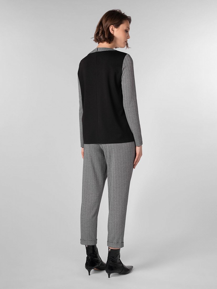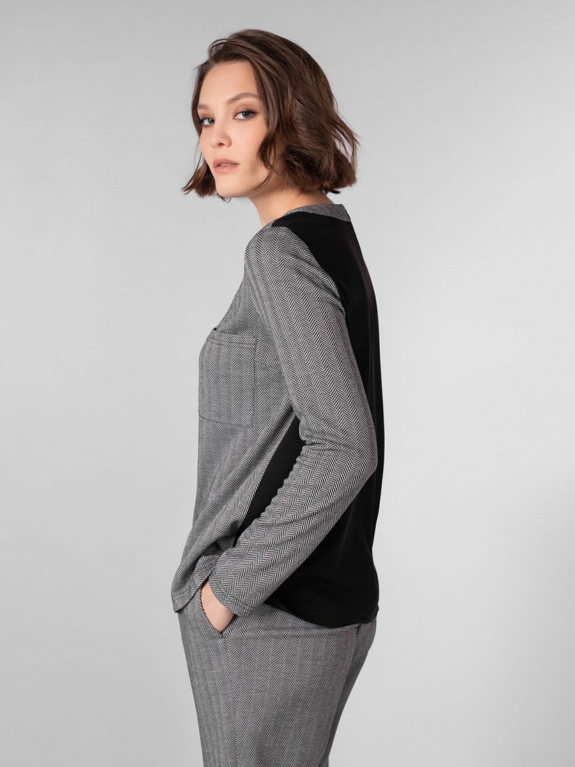 Джемпер из трикотажа прямого силуэта с круглой горловиной и втачным рукавом полной длины. Спинка контрастная черная. По горловине и манжетам контрастная отделка в полоску.
