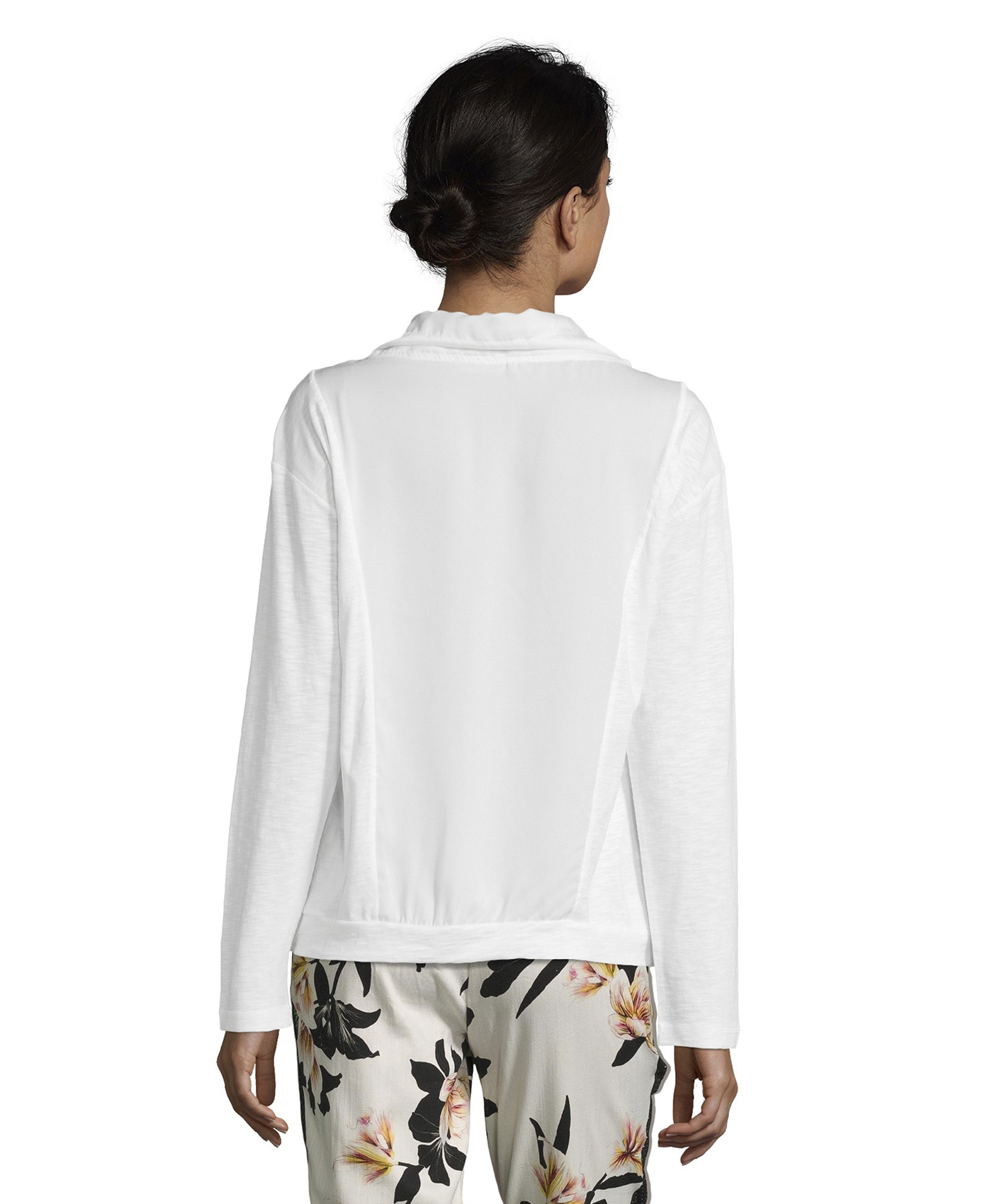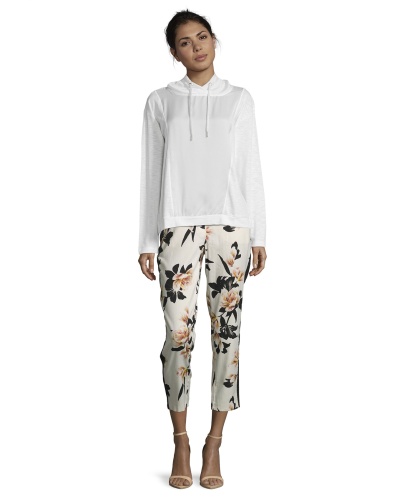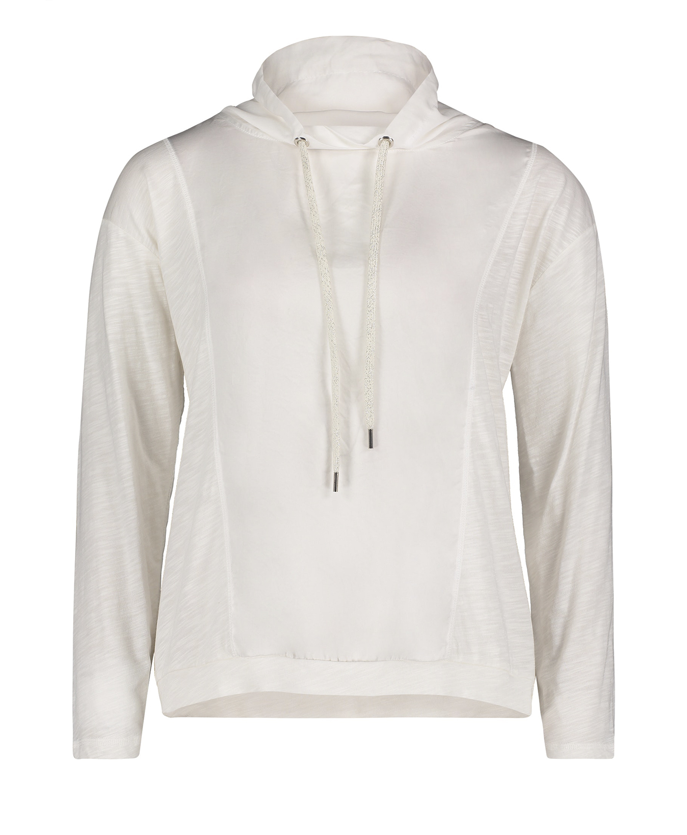 Джемпер прямого покроя. Длинные рукава, капюшон на кулиске. Сочетание приятных к телу материалов. Отличный вариант для прогулок и занятий спортом.