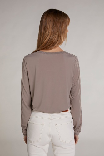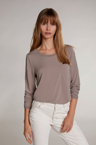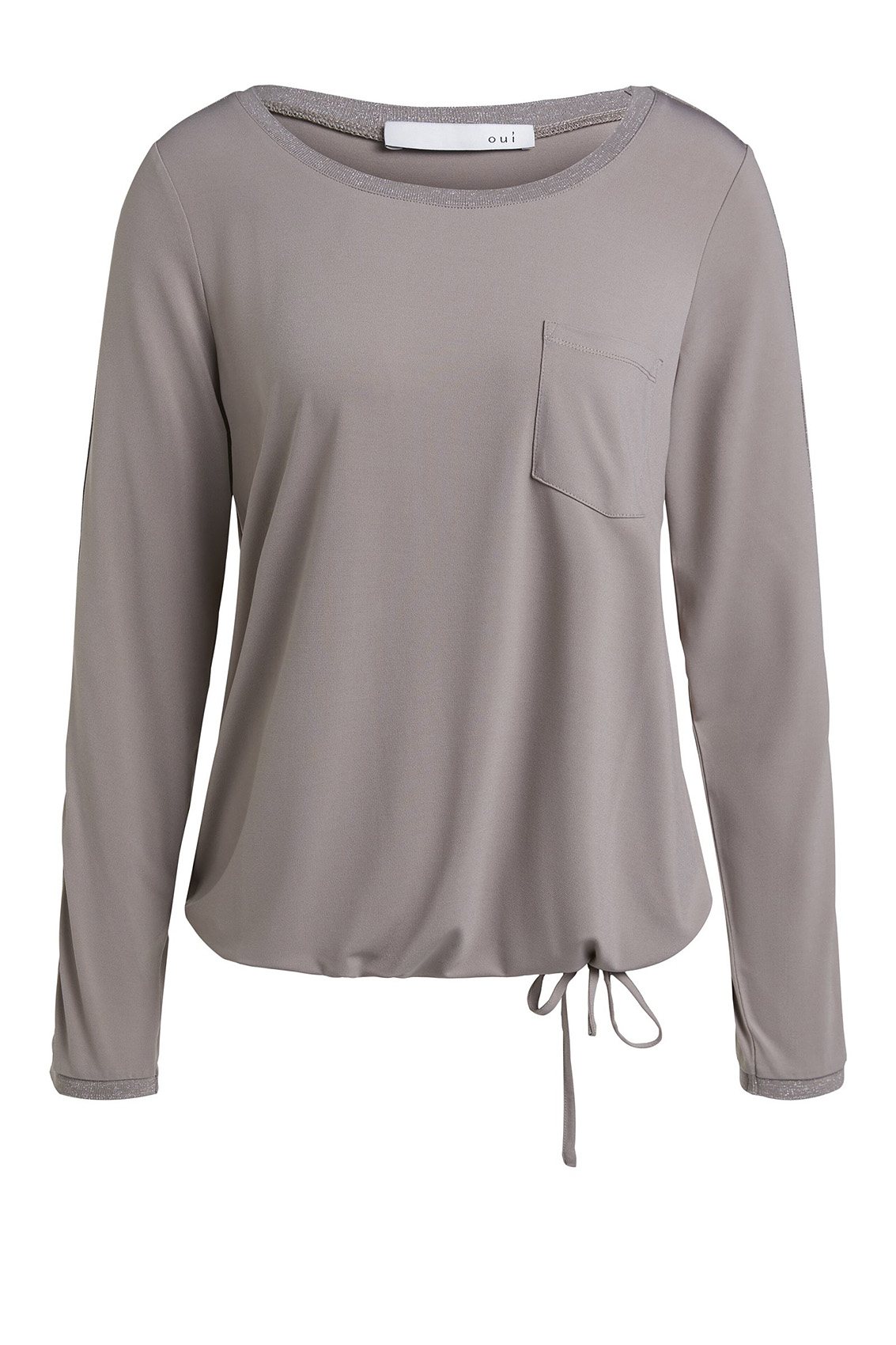 Футболка-лонгслив совершенно необходима в любом гардеробе. Прямой покрой, круглый вырез горловины, втачные рукава полной длины, карман на груди, кулиска по низу изделия. Декоративная отделка с нитью люрекса на горловине и рукавах придает образу элегантный блеск.