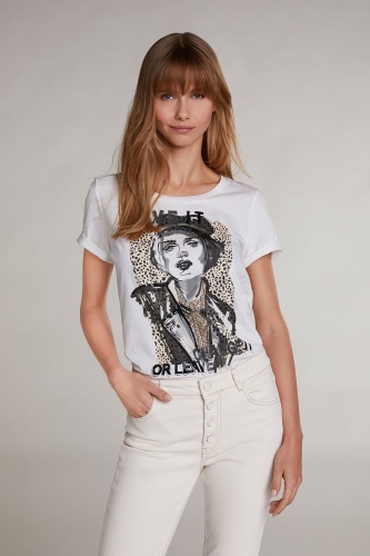 Белая футболка привлекает внимание своим смелым принтом. Прямой крой, круглый вырез горловины, короткие втачные рукава с фиксированными манжетами. Хлопковый материал приятен к телу и обеспечивает комфорт в ношении. Футболка создает демократичный образ и прекрасно сочетается как с брюками, так и с юбкой.