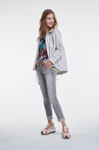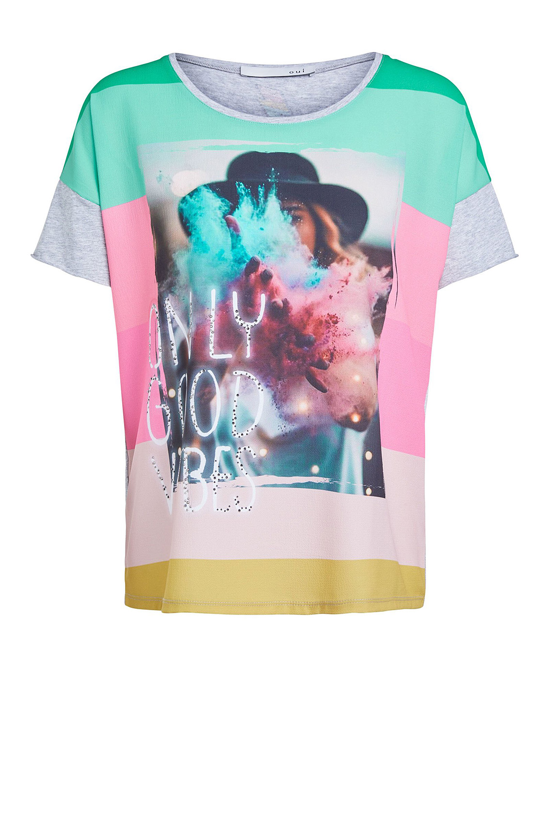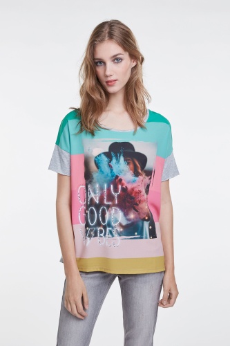 Стильная футболка с яркми принтом. Свободный покрой, круглый вырез горловины, короткий комбинированный рукав. Декор стразами придает образу нотку гламура. Приятный к телу материал из смеси модала и хлопка обеспечивает комфорт.