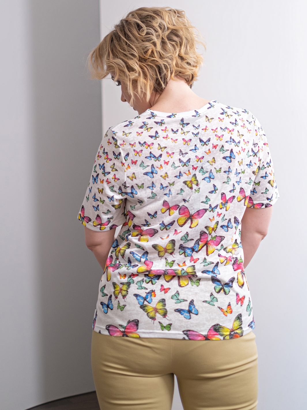 Футболка из легкой полупрозрачной ткани прекрасно подойдет для теплой погоды. Принт с бабочками создаст игривое настроение. Прямой крой скрывает недостатки фигуры и придает легкость силуэту. Короткий втачной рукав позволяет оголить руки и визуально стройнит. Круглый вырез горловины подчеркивает изящество линии шеи.
