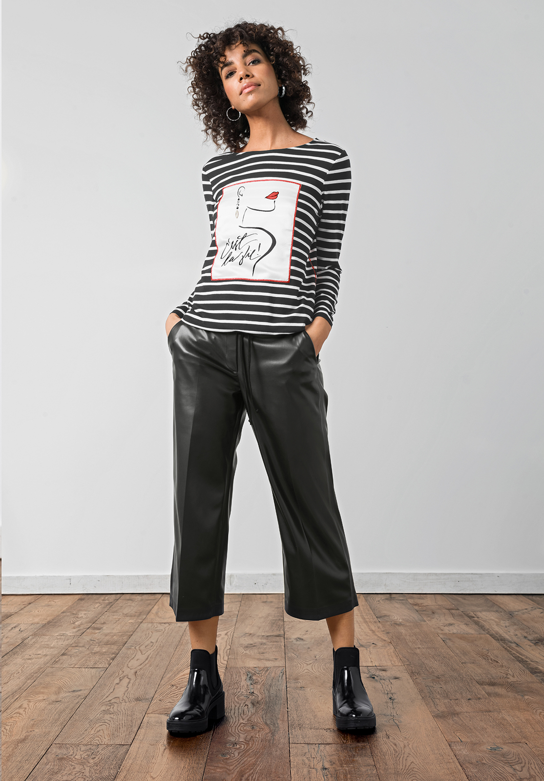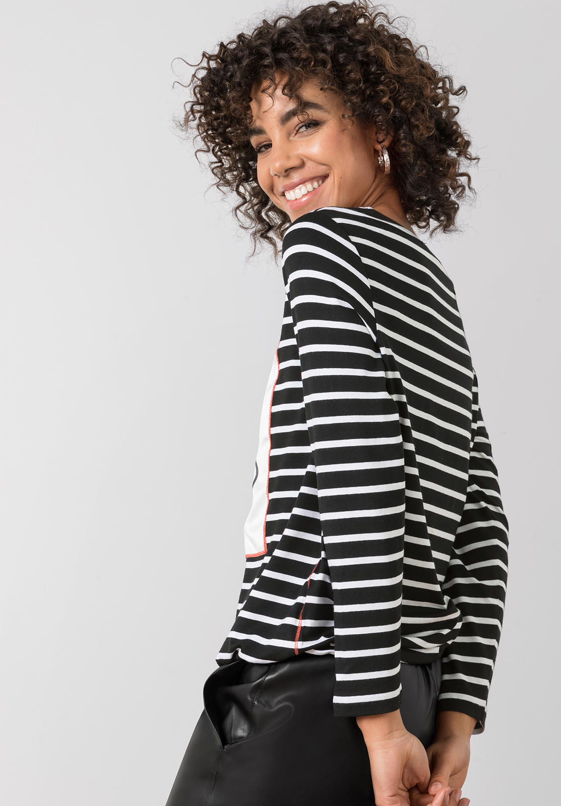 Футболка прямого кроя с длинным рукавом в узкую полоску. Прямой крой. Стильный fashion-принт на груди. Широкий овальный вырез горловины, длинный втачной рукав.