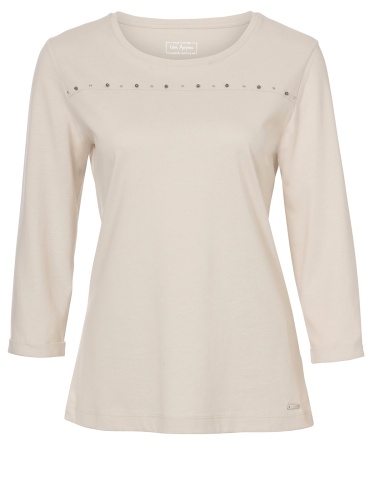Бежевая хлопковая футболка с рукавом 3/4. Базовый элемент гардероба любой женщины. Футболка универсальна, может выступать как самостоятельный верх или надеваться под жакет , кардиган или блейзер. Натуральный материал приятен к телу и комфортен в ношении. Круглый вырез горловины, втачной рукав. Футболка декорирована бусинами на груди.