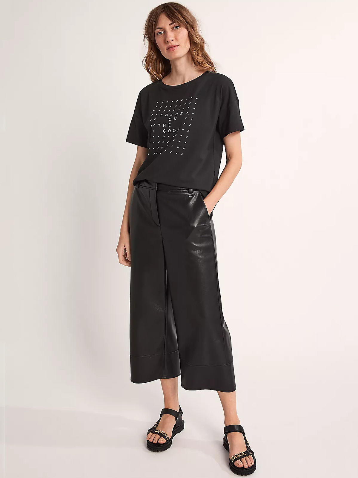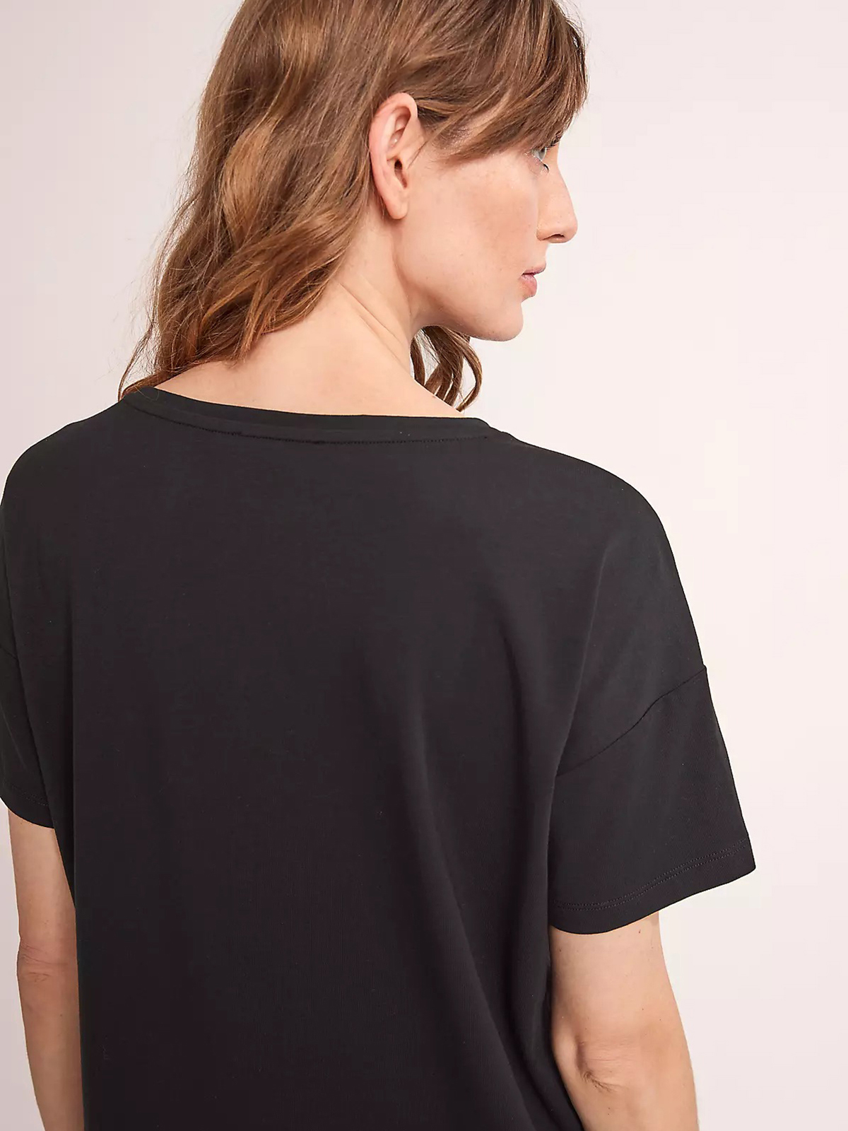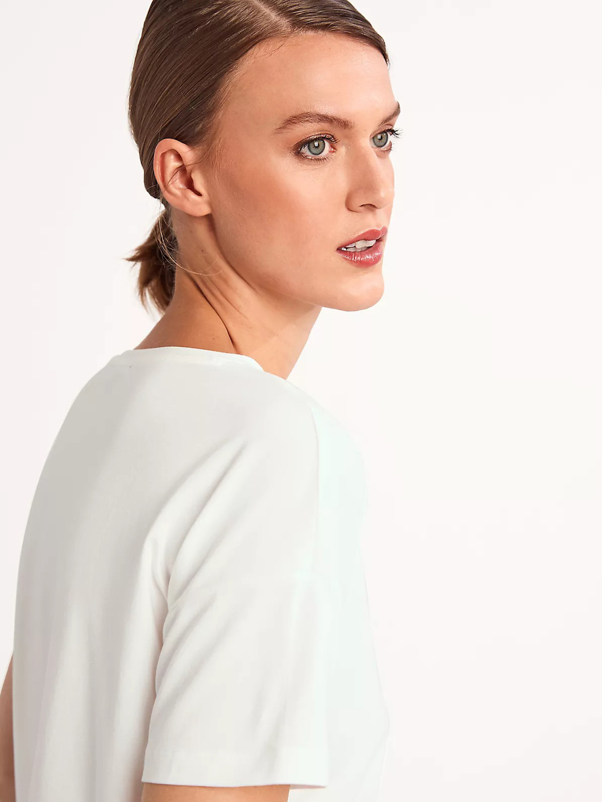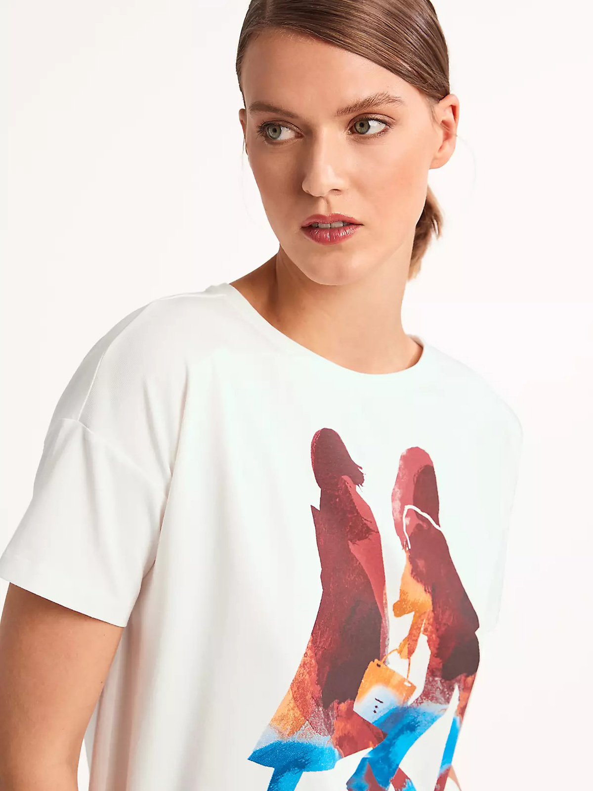 Однотонная футболка с принтом на груди. Материал из смесового хлопка обеспечивает хорошую посадку изделия по фигуре. Круглый вырез горловины, короткий втачной рукав.