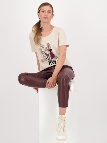 Однотонная бежевая футболка с принтом на груди. Прямой крой, широкий овальный вырез горловины, короткий втачной рукав. Футболка может выступать как самостоятельный верх или надеваться под жакет или кардиган.