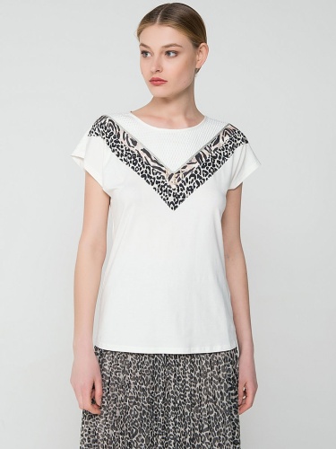Белая футболка полуприлегающего силуэта совсем не выглядит скучно! А все благодаря декору, который сочетает в себе ракушки, звериный принт и ажурные элементы.