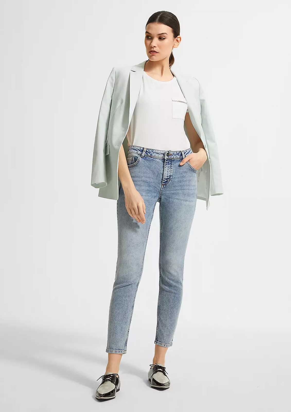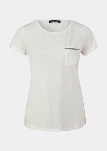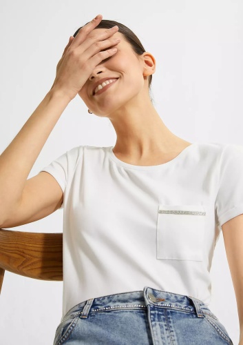 Однотонная белая футболка – базовый элемент любого современного гардероба. Короткий втачной рукав с отворотом, широкий овальный вырез горловины. На груди накладной карман, украшенный декоративной лентой.