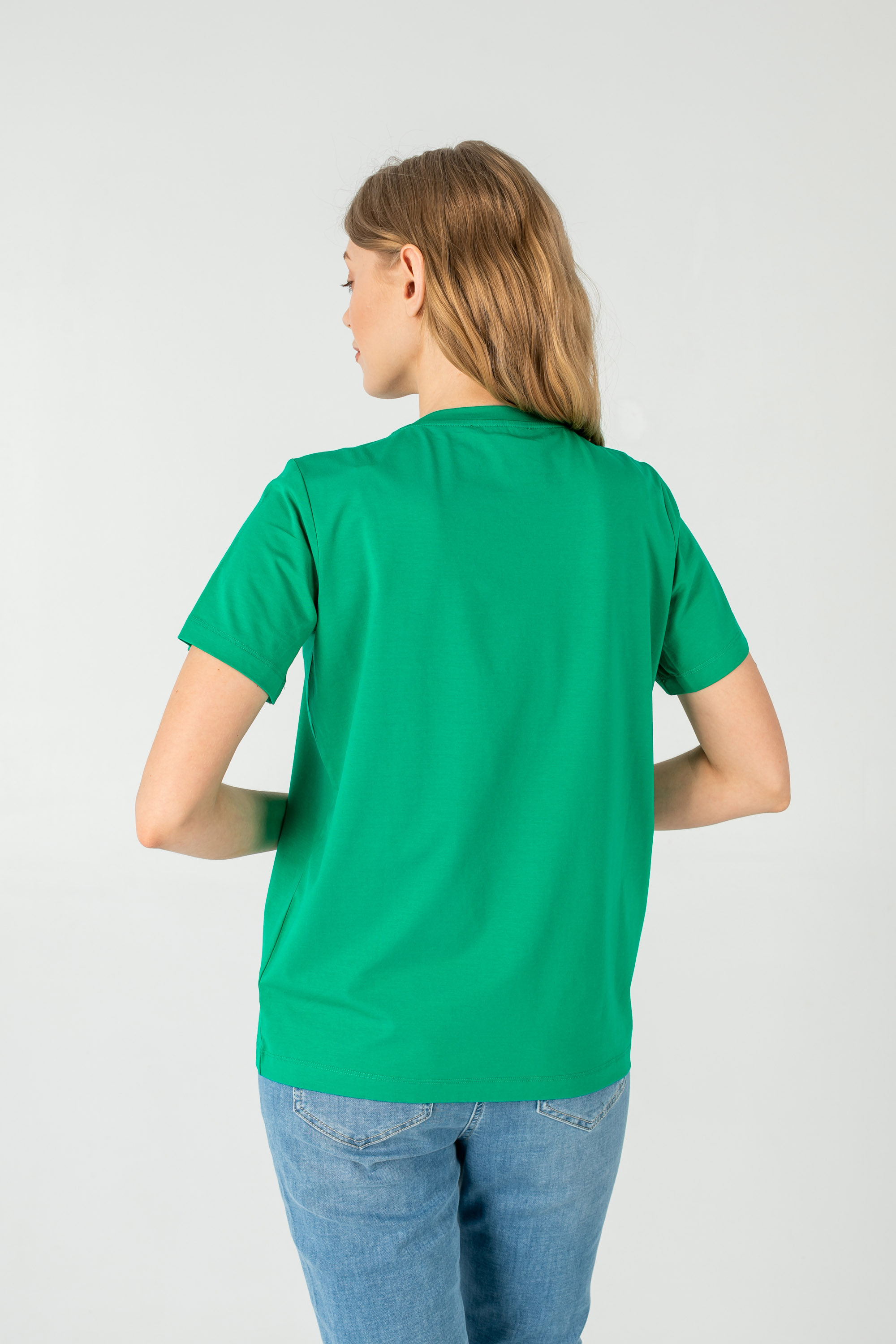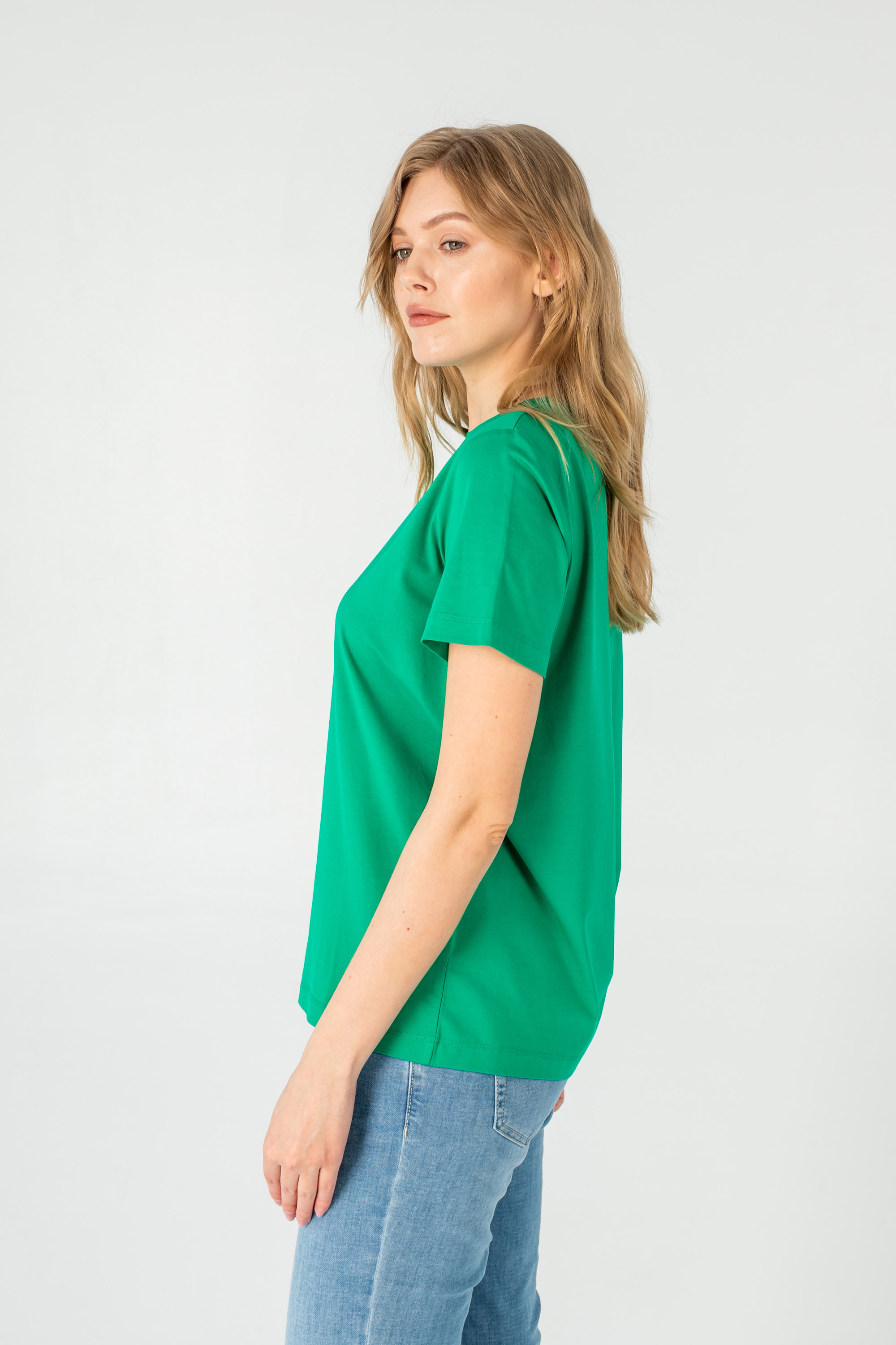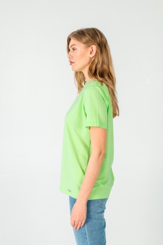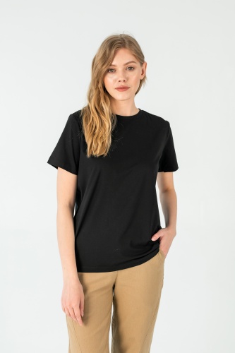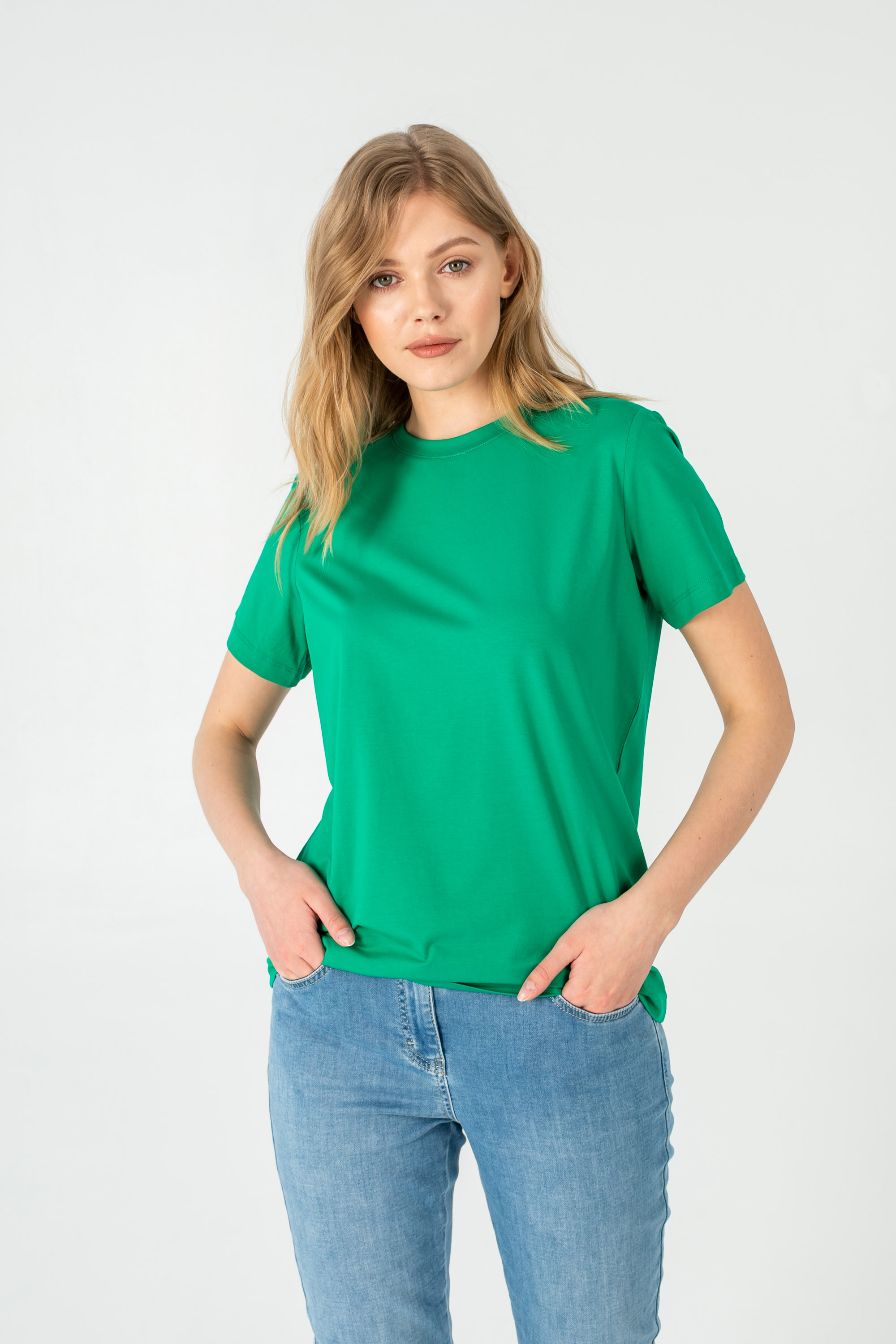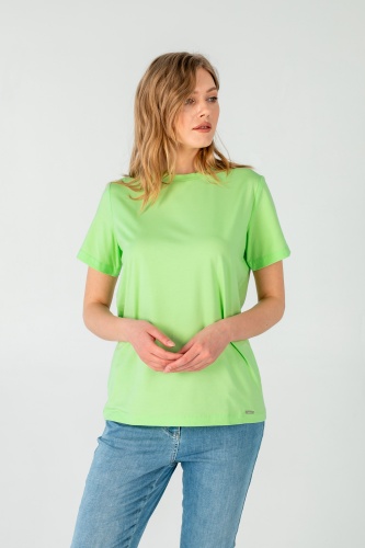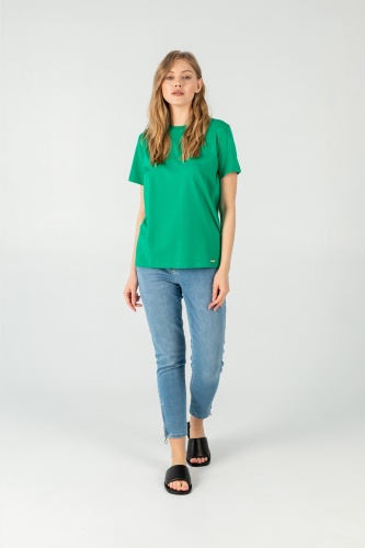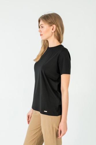 На сайте указаны российские размеры. Ткань: материал из смеси хлопка (49%), вискозы (46%) и эластана (5%) Крой: однотонная базовая футболка прямого силуэта средней длины. Имеет круглый вырез и свободный короткий рукав-реглан. Подходит под разные типы фигур. Отделка: украшена фирменным шильдиком с надписью Stern. Идеальная базовая футболка, которая станет самостоятельным элементом или первым слоем для жакетов, рубашек, джемперов и кардиганов.
