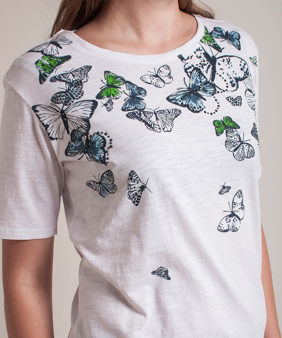 Футболка прямого покроя. Вырез горловины "лодочка". Принт с изображением бабочек подчеркивает нежный образ.