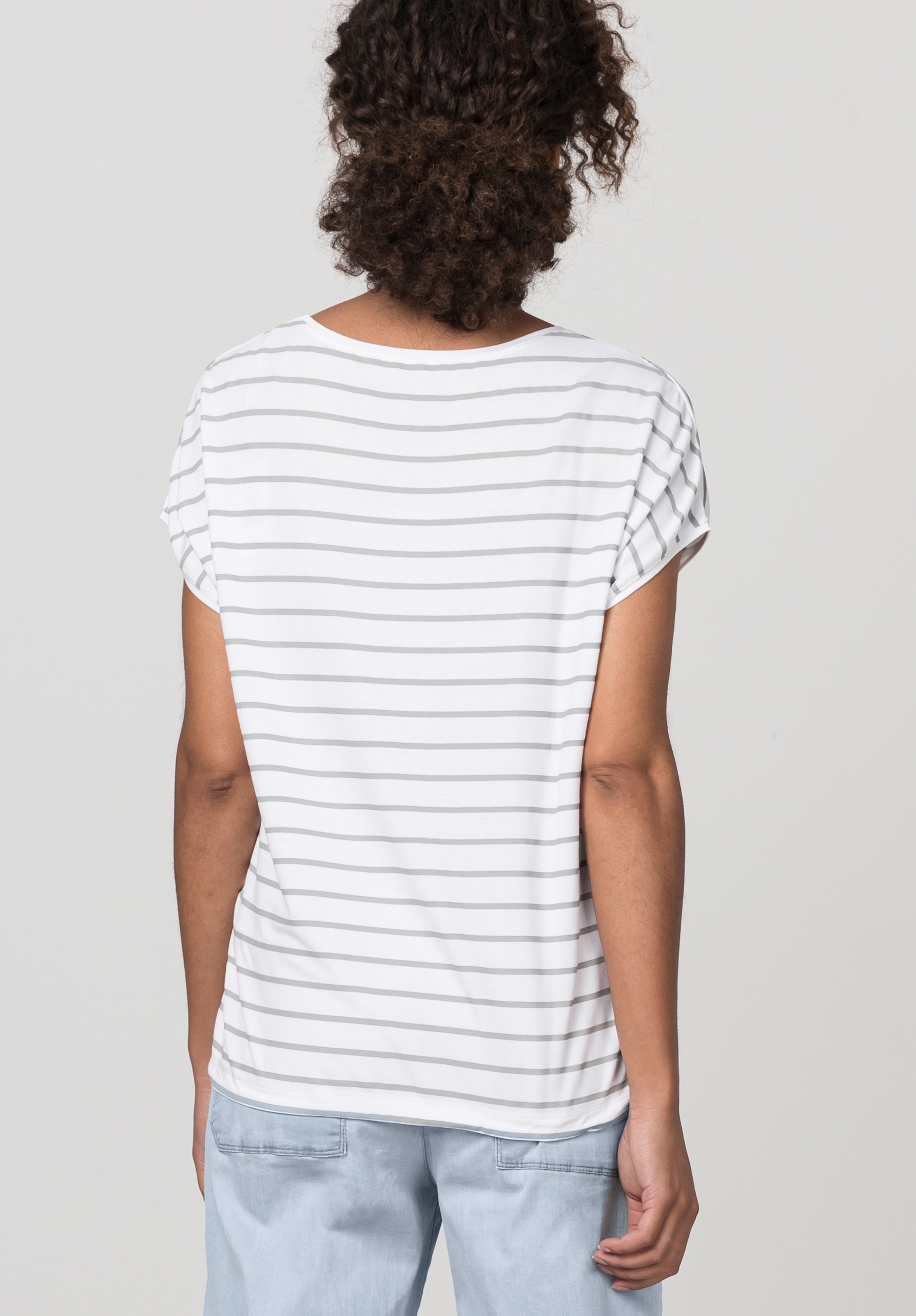 Футболка с принтом, круглым вырезом и объемными рукавами. Атласная отделка спереди, трикотаж сзади. Кулиска с завязками на кромке.