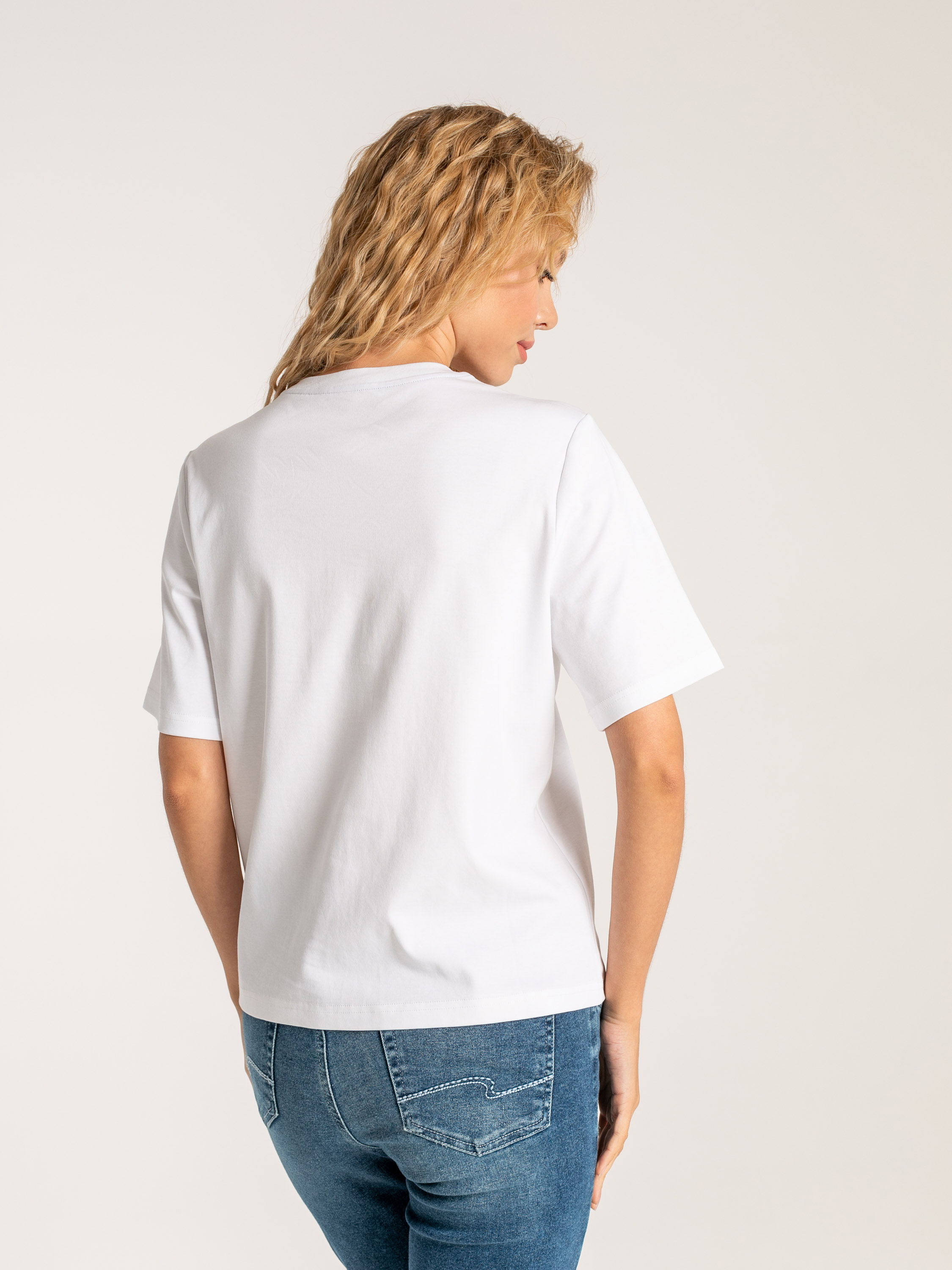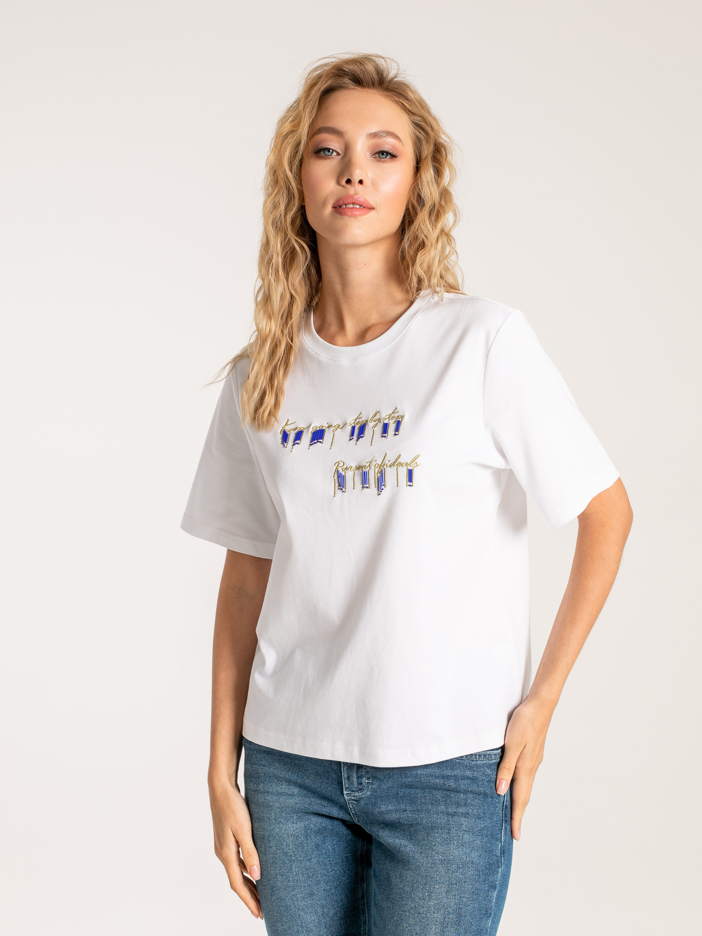 Футболка средней длины прямого силуэта из легкого 100% хлопка. По переду выполнена потрясающая вышивка. Укороченные втачные рукава. Круглый вырез горловины.