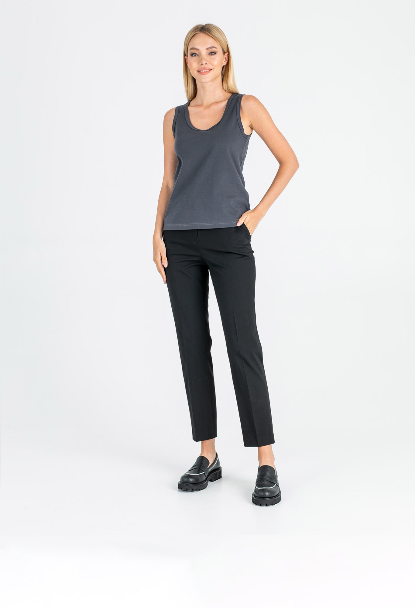 Классический слегка приталенный топ на широких лямках. Параметры модели: 86-61-91 см Рост 177 см