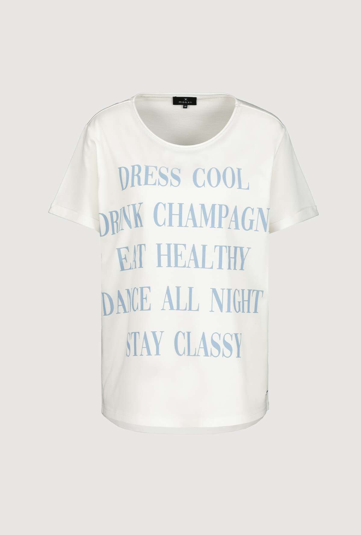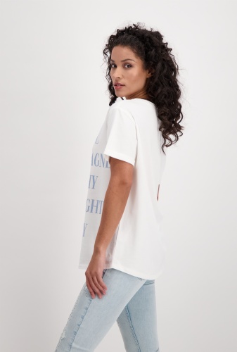 На сайте указаны Российские размеры. Футболка с короткими рукавами и круглым вырезом. На передней части футболки изображен крупный стильный текст. Прямой крой с подвернутыми концами рукавов, круглый вырез горловины с подвернутым краем и блестящим оверлочным швом с люрексом, а также удлиненная спина с закругленным низом. Параметры модели: 42 размер, рост 174 см