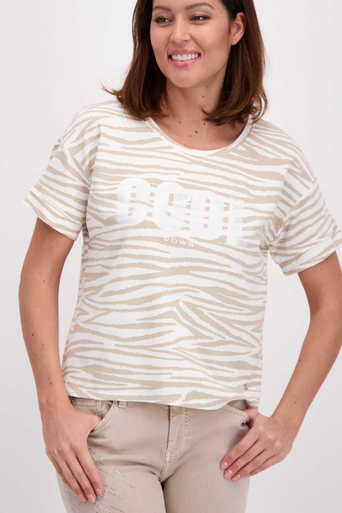 На сайте указаны российские размеры. Легкая футболка с короткими рукавами в анималистическом стиле. Модель с половиной рукавов имеет прямой фасон, круглый вырез горловины, края рукавов с притачными манжетами и необработанными краями, а также удлиненную спинку с закругленным краем. Великолепный рисунок зебры по всей поверхности оживляет дизайн. Параметры модели: 42 размер, рост 181 см