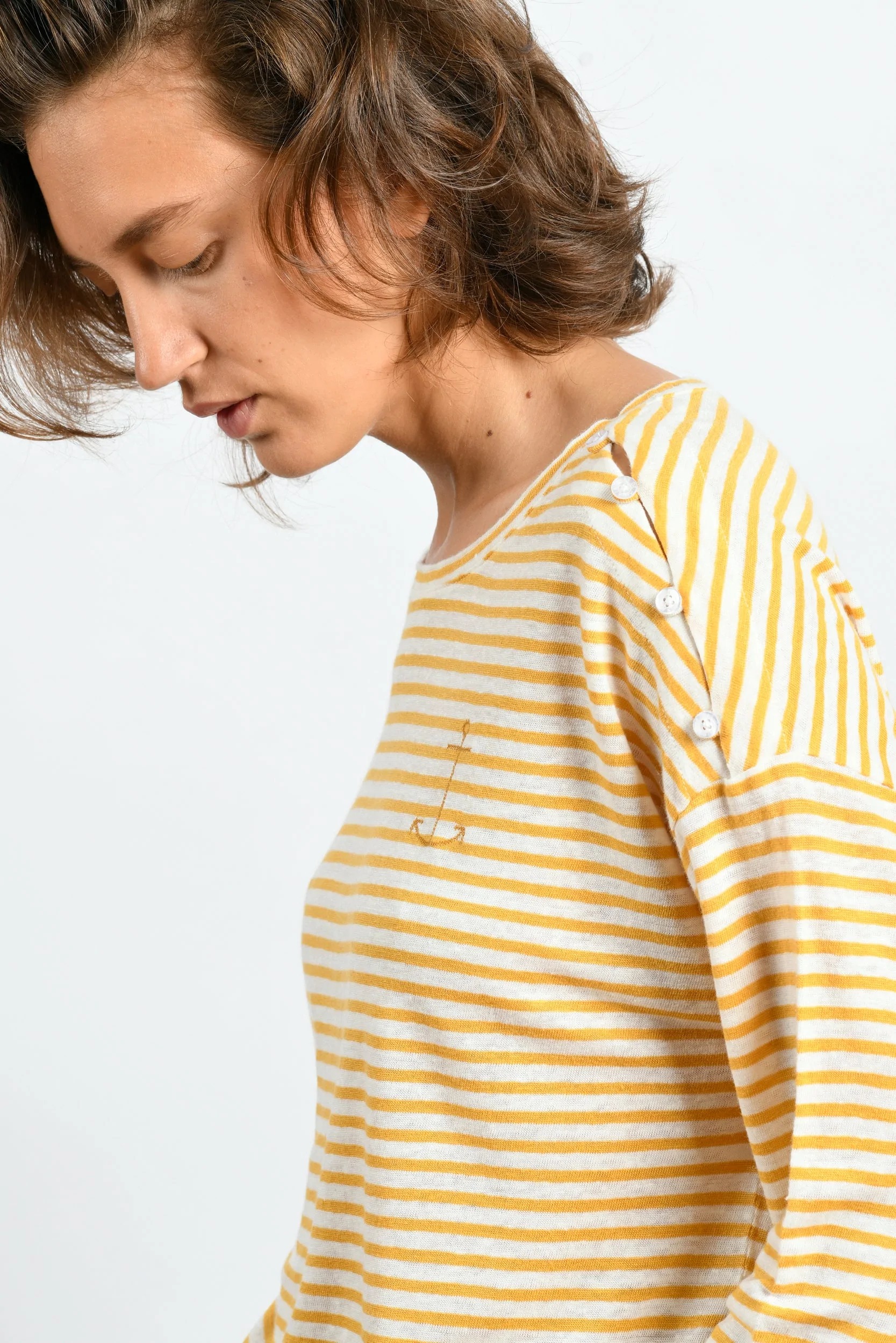 На сайте указаны Российские размеры. Футболка прямого кроя с длинными рукавами и спущенными плечами. Вышивка якоря на груди. На левом плече нарядная застежка с перламутровыми пуговицами. Круглый воротник. Небольшие разрезы по низу изделия.