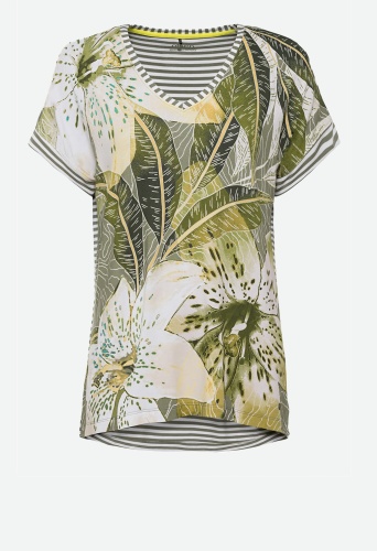 На сайте указаны российские размеры. Эта футболка - красивое сочетание сплошного цветочного принта спереди и классического полосатого узора сзади. Слегка закругленный V-образный вырез и манжеты, красиво подчеркнутые полосками. Рубашка немного длиннее сзади, чем спереди, создает красивую струящуюся драпировку и имеет облегающий крой. Бонус: он изготовлен из экологически чистого вискозного волокна ECOVERO™, созданного из древесины местного, контролируемого и органического выращивания.