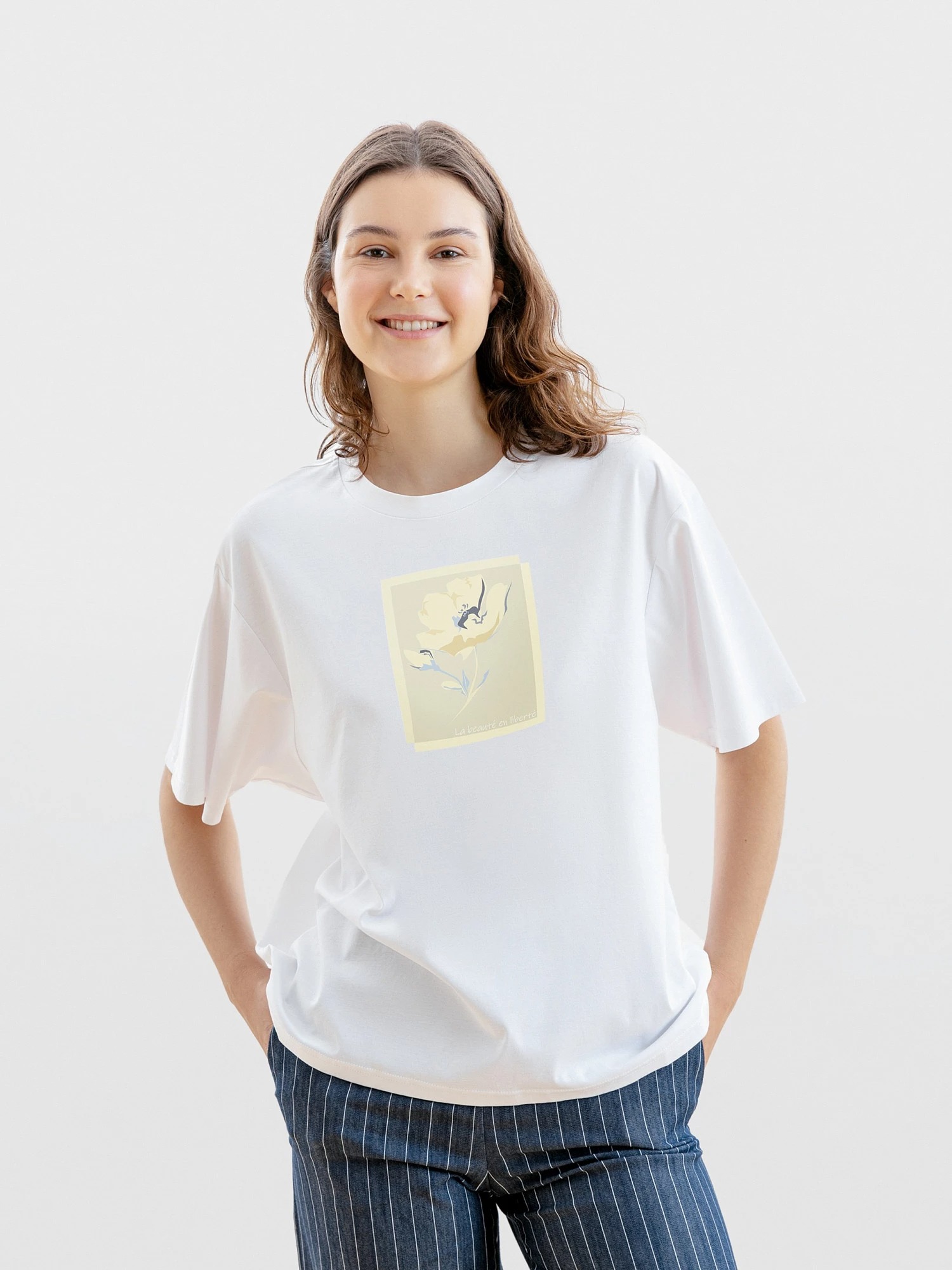 На сайте указаны российские размеры. Классическая белая футболка из 100% мерсеризированного хлопка прямого силуэта с круглой горловиной, спущенным плечом и коротким рукавом. Спереди цветочный моно-принт в бежевом цвете. Идеальное дополнение к повседневному образу. Рост модели на фото - 175 см.