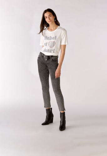 На сайте указаны российские размеры. Повседневный крой с чуть более длинными короткими рукавами. Оригинальный принт наизнанку с декоративными камнями. Контрастная цветная вышивка в форме сердца. Круглый вырез спортивного кроя. Рост модели 178 см
