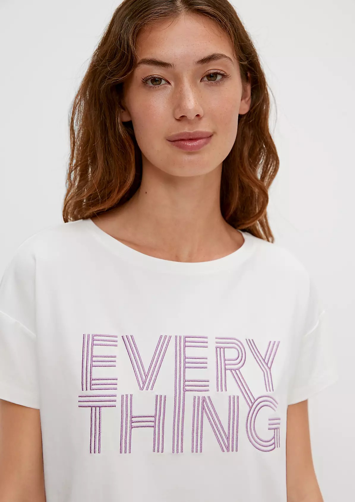 На сайте указаны российские размеры. Повседневная футболка с рукавом заниженной линией плеча. Детали: вышивка. Длина спины в 44 размере - 56 см.