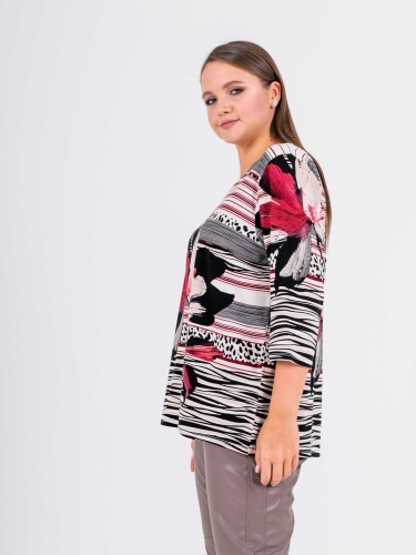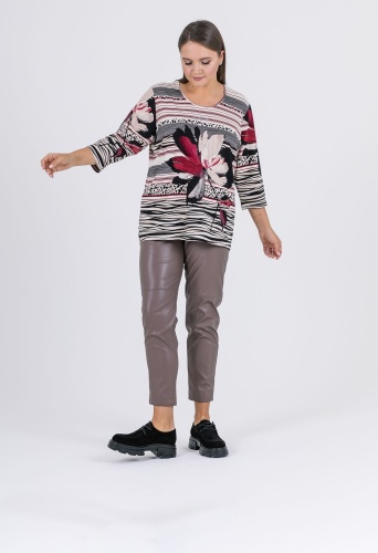 На сайте указаны российские размеры. Ткань: 92% вискоза, 8% эластан. Крой: комфортная модель с рукавами ¾ и круглым горлом. Свободные прямые рукава обеспечивает максимальный комфорт и свободу при движении. Универсальная модель, подходящая женщинам с разным типом фигур, а особенно дамам с пышными формами. Отделка: главное украшение – изображение цветка расположено в двух сторон джемпера. Перед украшен россыпью элегантных страз, которые добавляют блеска и торжественности. Сочетайте с джинсами и кожаными брюками из ассортимента Stern.