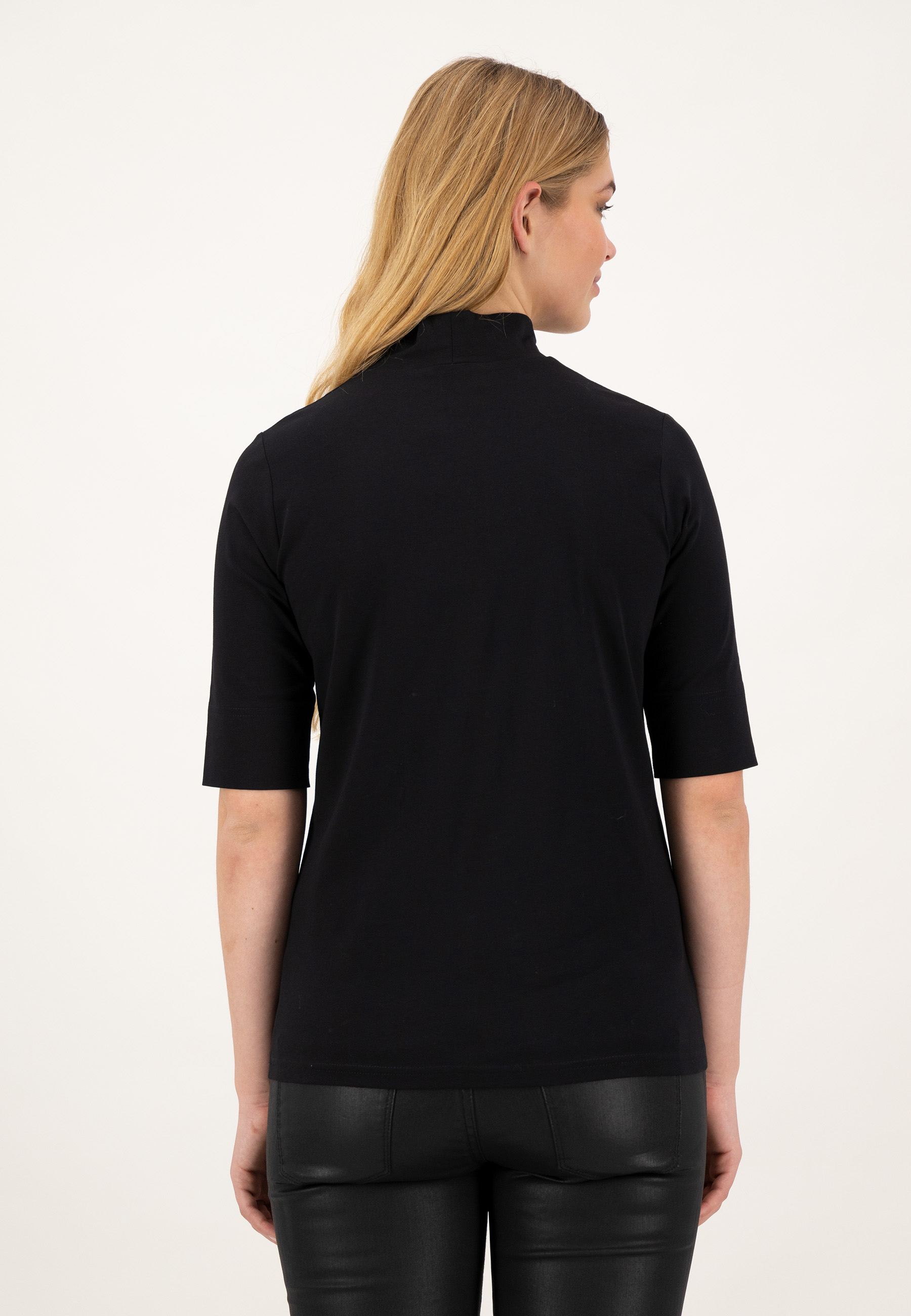 На сайте указаны российские размеры. Черная водолазка с модными короткими рукавами — актуальная комбинация для модных образов осенью и зимой. Рубашку можно носить с повседневным кардиганом или элегантно сочетать со стильным блейзером . Благодаря сочетанию комфортного эластана и высококачественного хлопка приталенная рубашка с короткими рукавами и водолазкой особенно удобна в носке. Кроме того, приталенный крой рубашки с высоким воротником создает красивую фигуру. Особое внимание привлекает маленькое сердечко из сверкающих серебряных стразов на подоле. Наша модель ростом 177 см. Измерения для размера 44: Окружность груди: 92 см Талия: 88 см Бедра: 97 см Длина по спинке: 62 см. Длина рукава: 31 см.