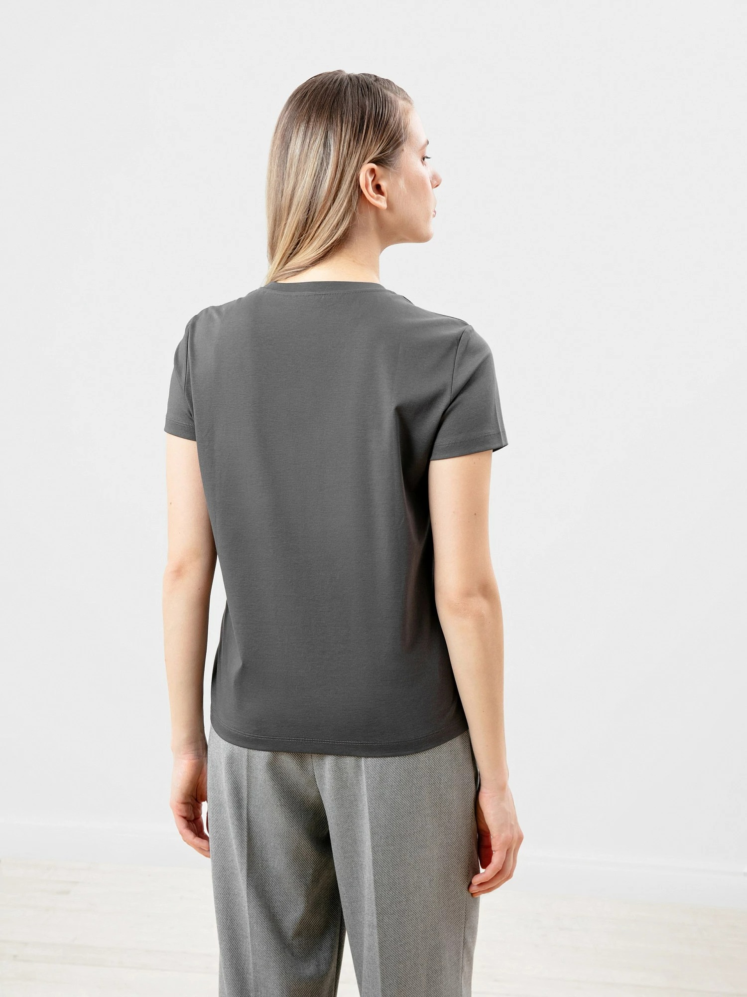 На сайте указаны российские размеры. Футболка полуприлегающего силуэта из трикотажного полотна темно-серого цвета с ярким контрастным абстрактным принтом. Вырез горловины круглый, рукав короткий втачной. Эта модель станет прекрасным нижним слоем под жакеты. Рост модели на фото - 175 см.