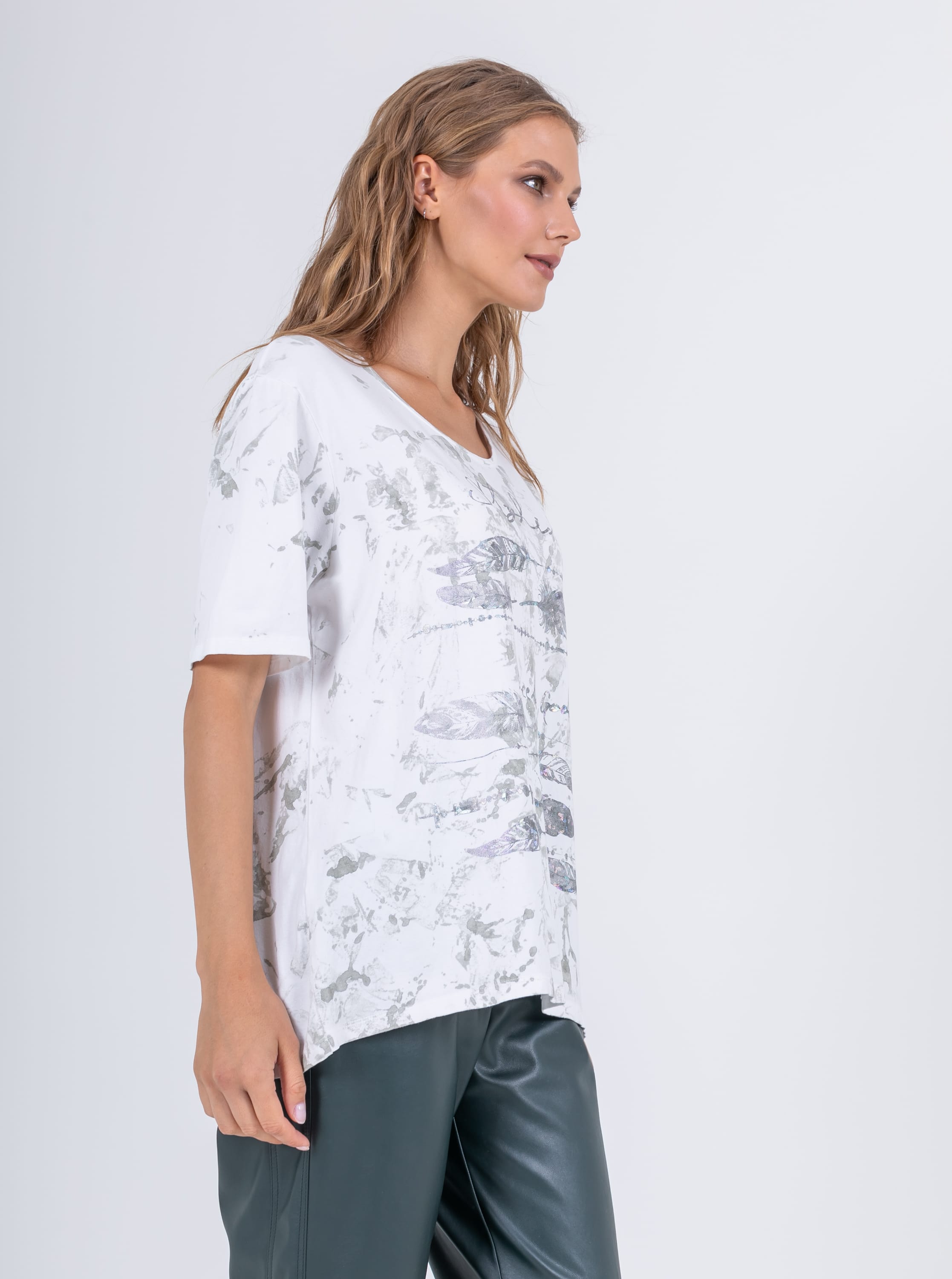 На сайте указаны российские размеры. Ткань: изготовлена из высококачественной вискозы (92%) – экологичного материала, хорошо пропускающего воздух и впитывающего излишки влаги, и эластана (8%), придающего ткани упругость. Крой: удлиненная футболка с цельнокроеным рукавом, который добавляет комфорта при носке и не стесняет движений, насколько активными вы бы не были. Модель идеально скрывает недостатки, не облегает фигуру, что делает ее идеальной вещью для женщин с пышными формами и большой грудью. Имеет неглубокий круглый вырез. Отделка: принт по всей поверхности футболки: в передней части на элементы рисунка нанесено сверкающее покрытие, которое выдерживает множество циклов стирки. В задней части футболки принт без нанесения.