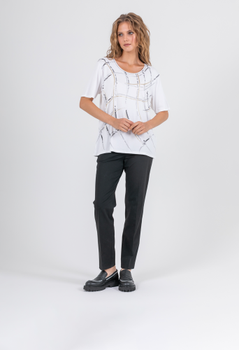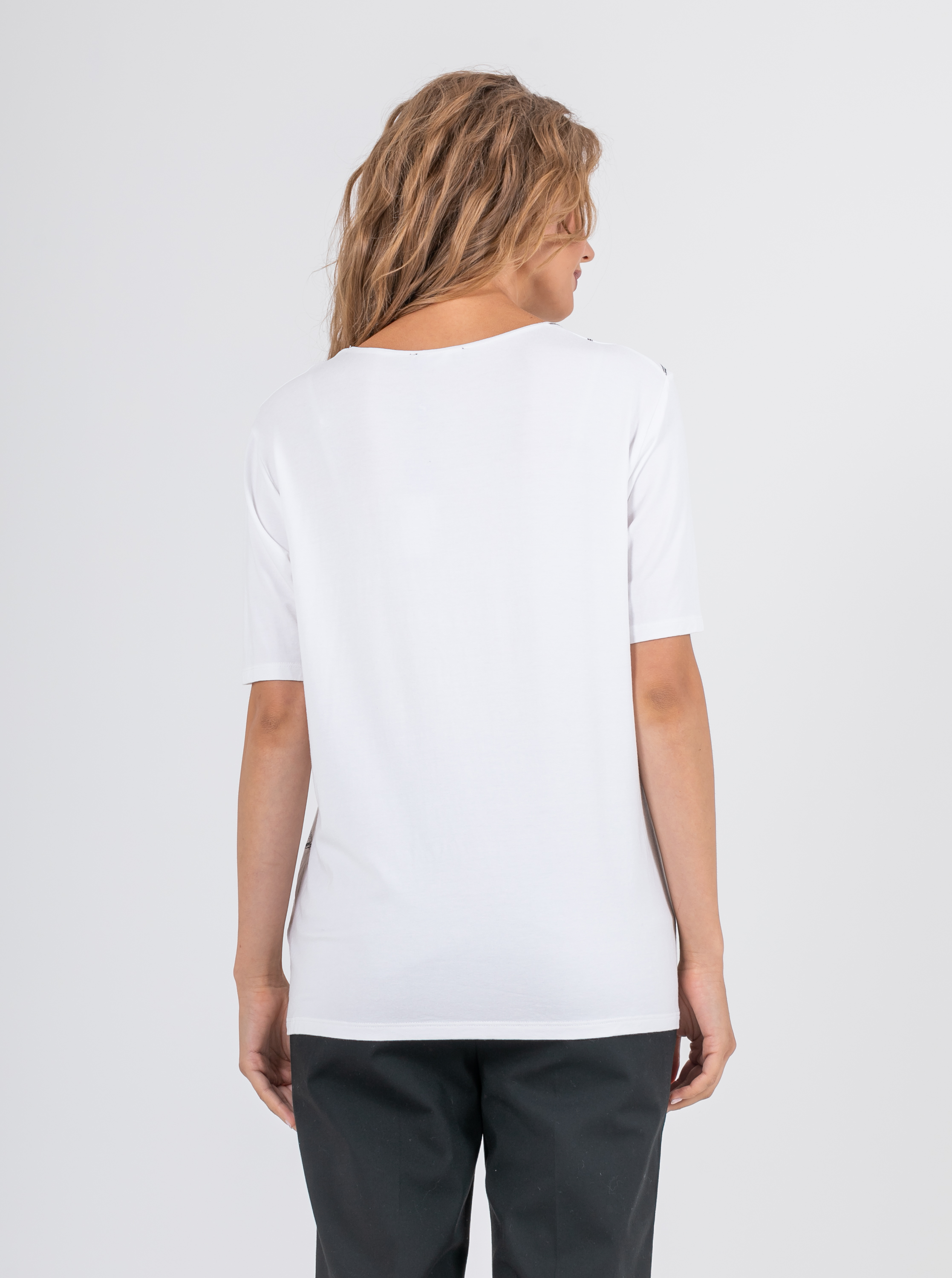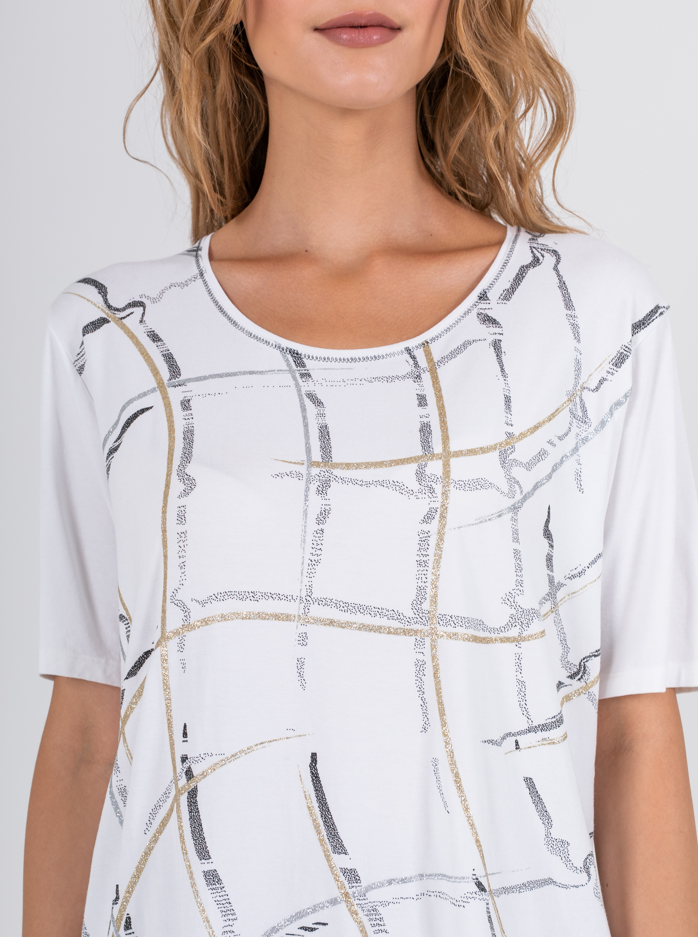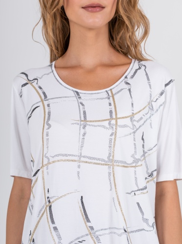 Футболка средней длины прямого силуэта из легкой, мягкой вискозы с добавлением эластана. По переду выполнен нежный принт. Укороченные втачные рукава. Круглый вырез горловины с отделочной строчкой по переду.