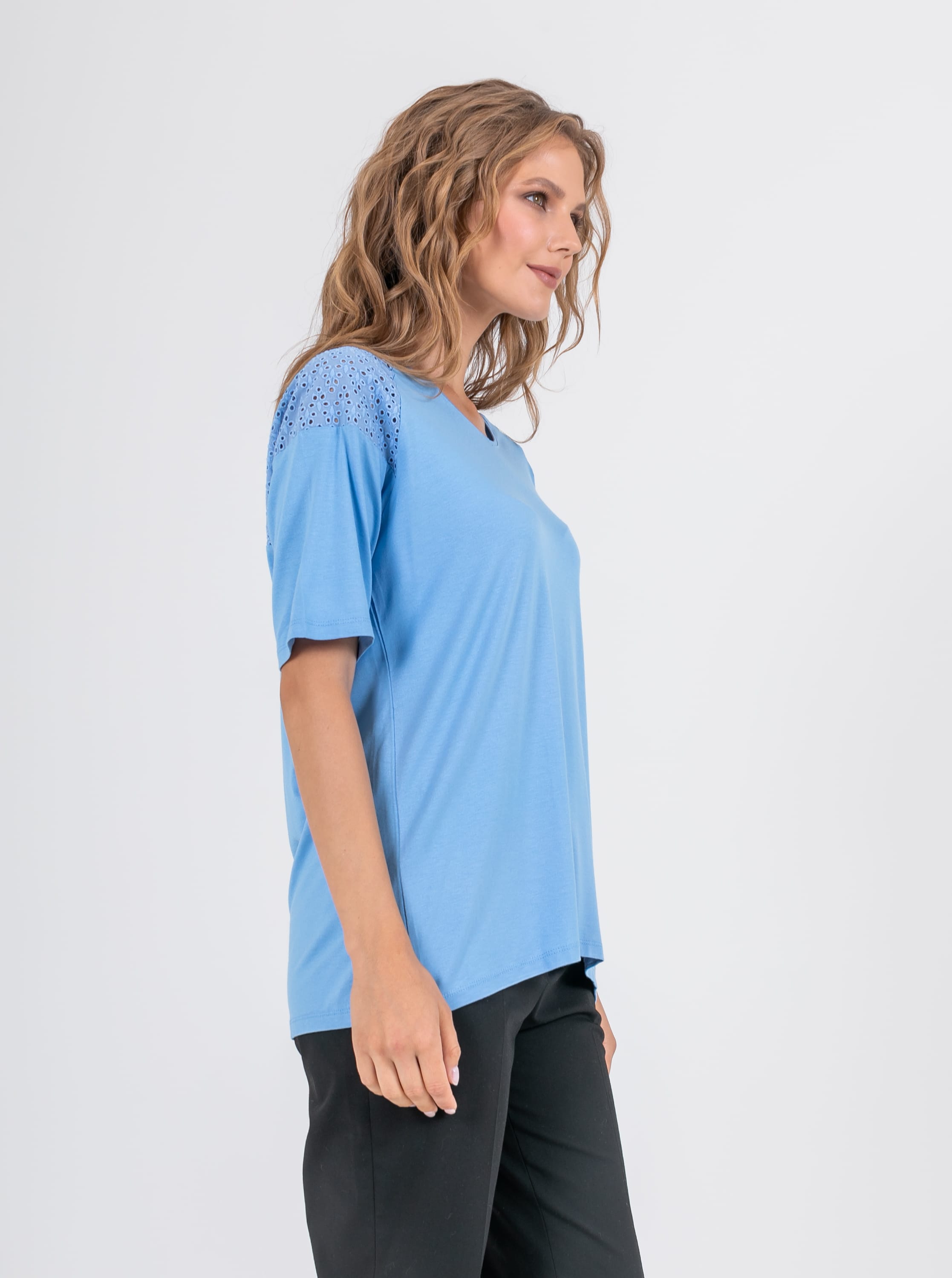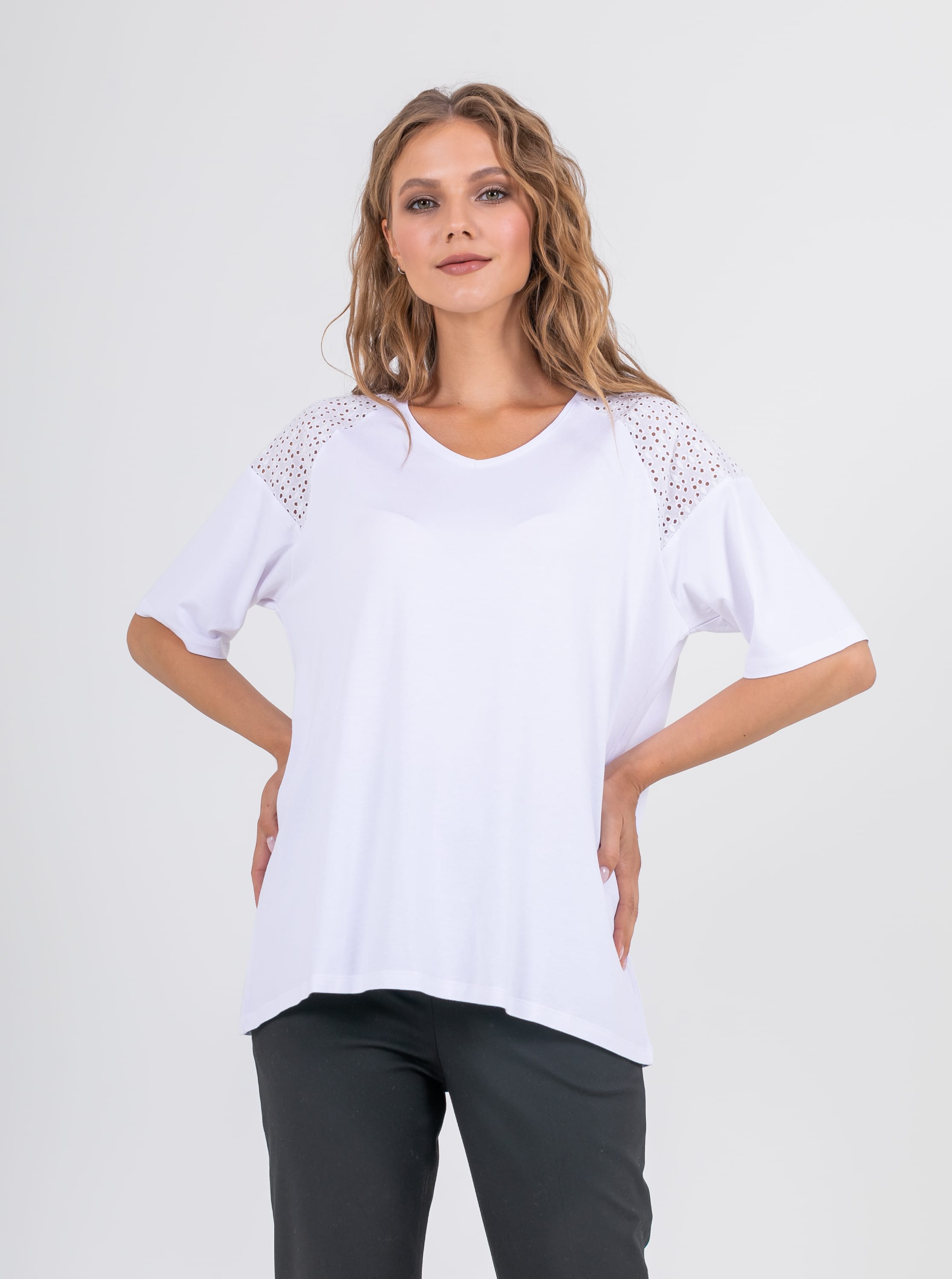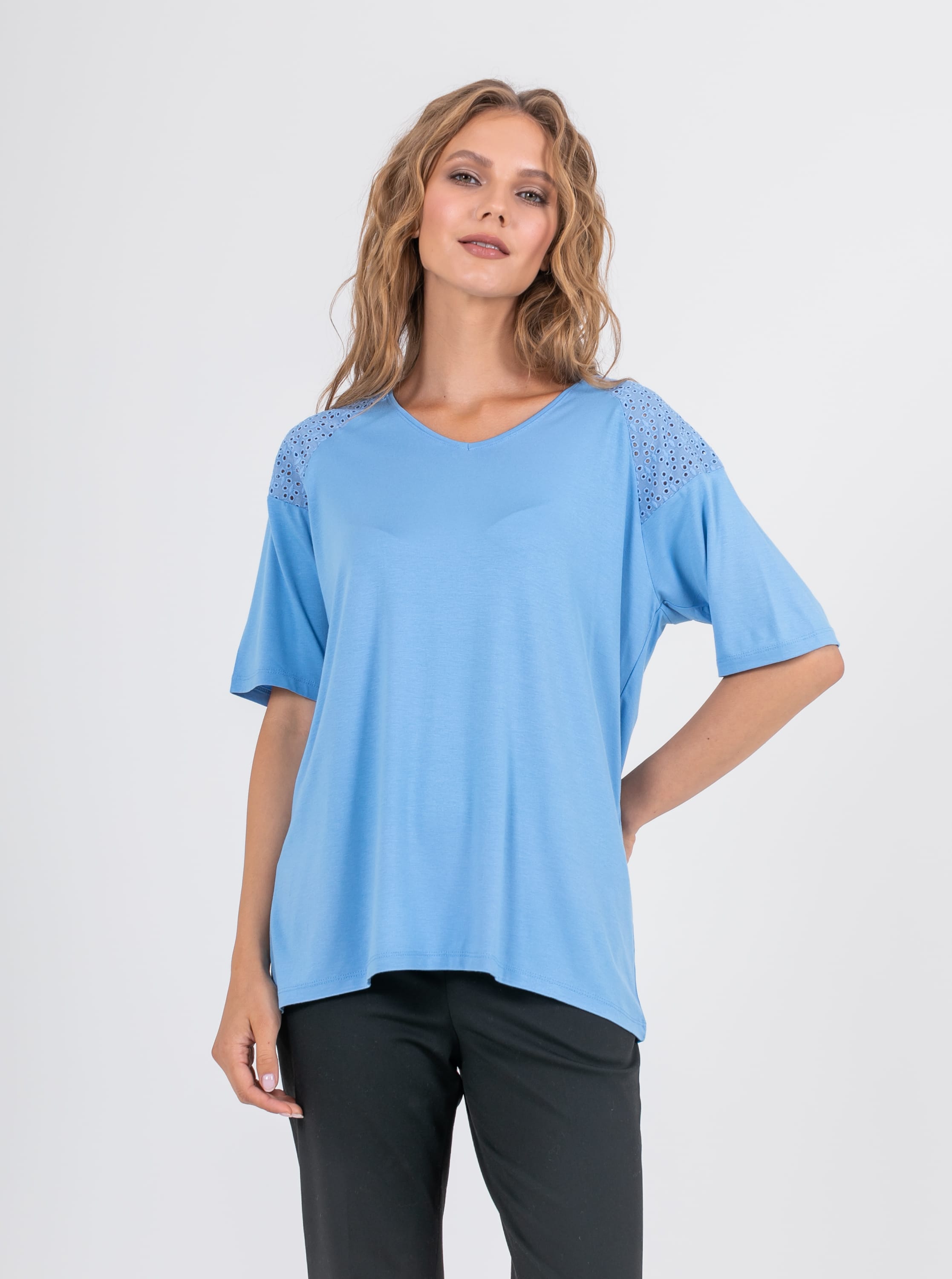На сайте указаны российские размеры. Ткань: изготовлена из высококачественной вискозы (92%) – экологичного материала, хорошо пропускающего воздух и впитывающего излишки влаги, и эластана (8%), придающего ткани упругость. Крой: футболка средней длины свободного силуэта. Имеет круглый вырез и свободные рукава-регланы, которые дарят максимум свободы и комфорта. Представлена в двух цветах – белом и небесно-голубом. Отделка: рукава и верхняя часть спинки украшены изысканным шитьем, которое добавляет романтичности и женственности всему образу.