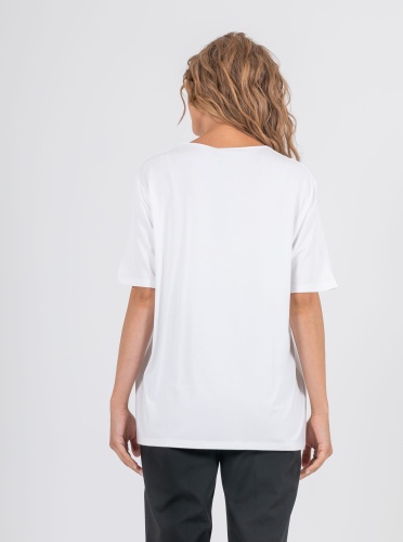 На сайте указаны российские размеры. Ткань: изготовлена из высококачественной вискозы (92%) – экологичного материала, хорошо пропускающего воздух и впитывающего излишки влаги, и эластана (8%), придающего ткани упругость. Крой: футболка удлиненная прямого силуэта с коротким свободным рукавом-регланом. Классическая модель с круглым вырезом – база, которая прекрасно смотрится на женщинах разного роста и комплекций. Обеспечивает максимальный комфорт, прекрасно садится по фигуре. Отделка: футболку украшает стильный принт с актуальными уже несколько сезонов монстерами. Вырез обрамляет контрастная синяя строчка-зигзаг, добавляющая образу оригинальности.