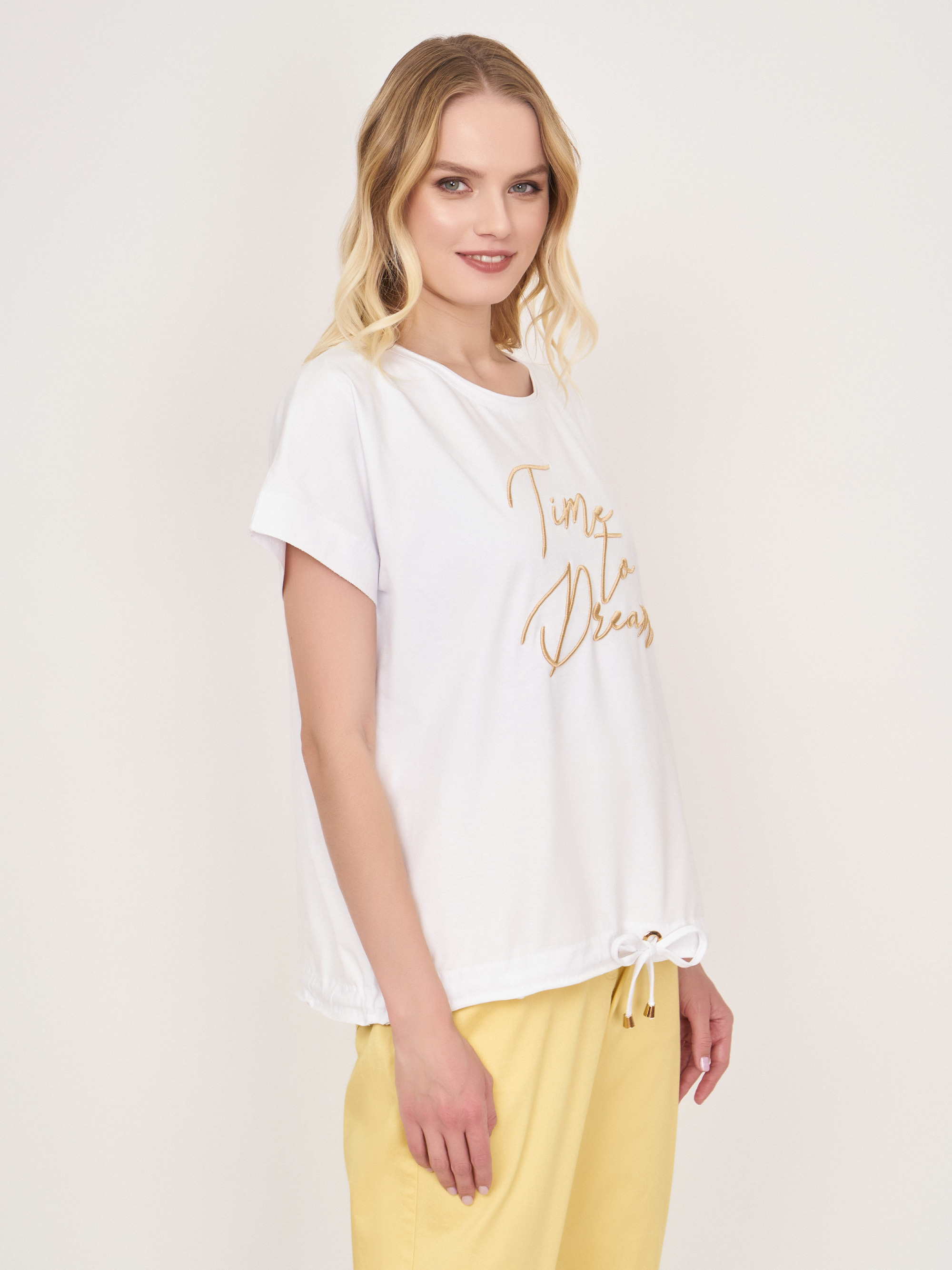 На сайте указаны российские размеры. Белый прямой хлопковый джемпер-футболка с круглым вырезом, с коротким рукавом, с бежевой вышитой надписью, с кулиской понизу изделия. Длина по спинке: 60 см. Рост модели: 176 см.