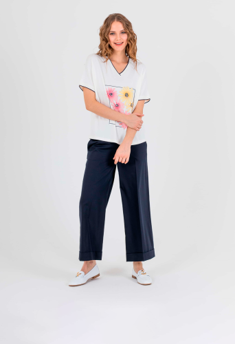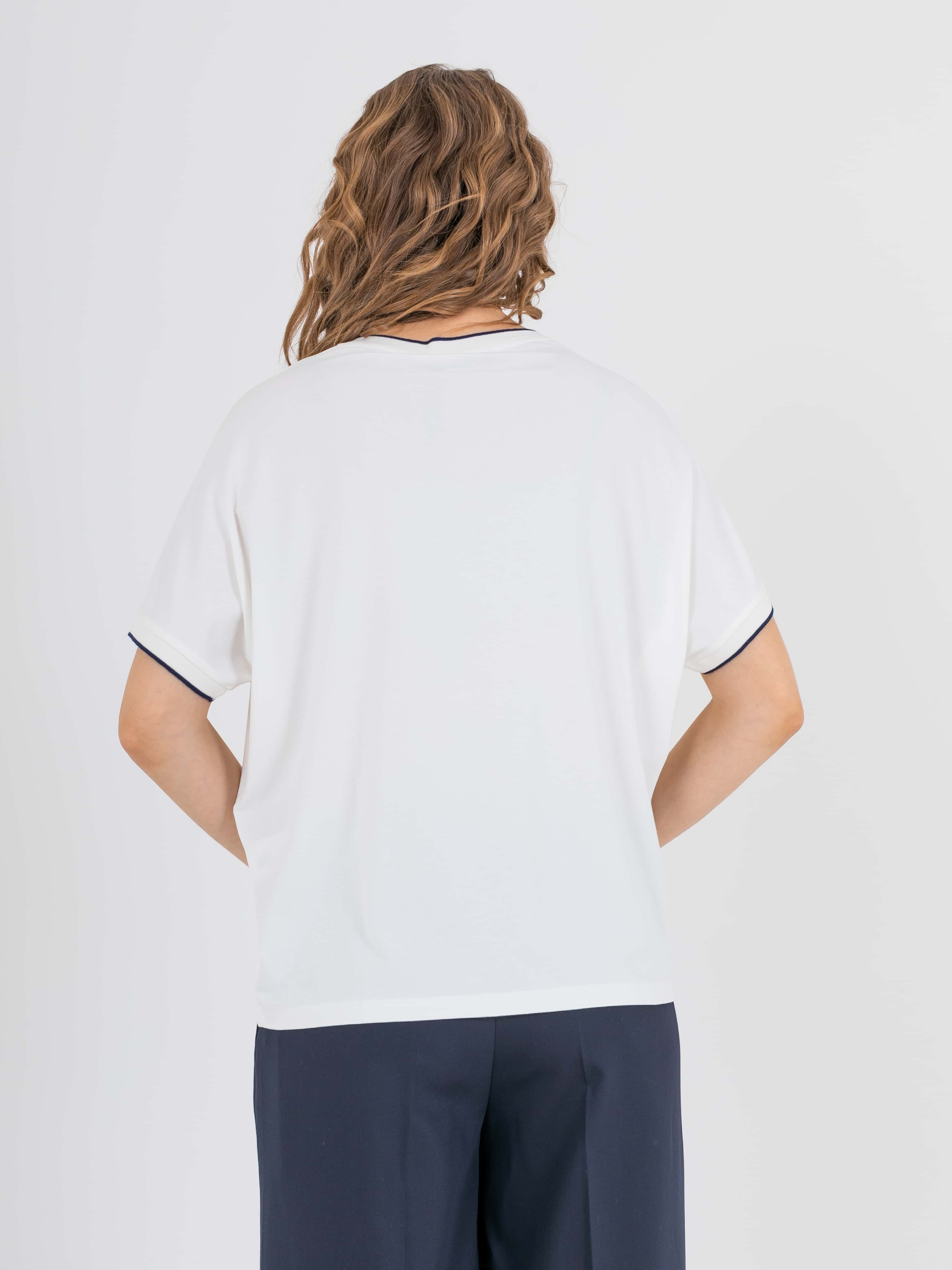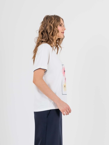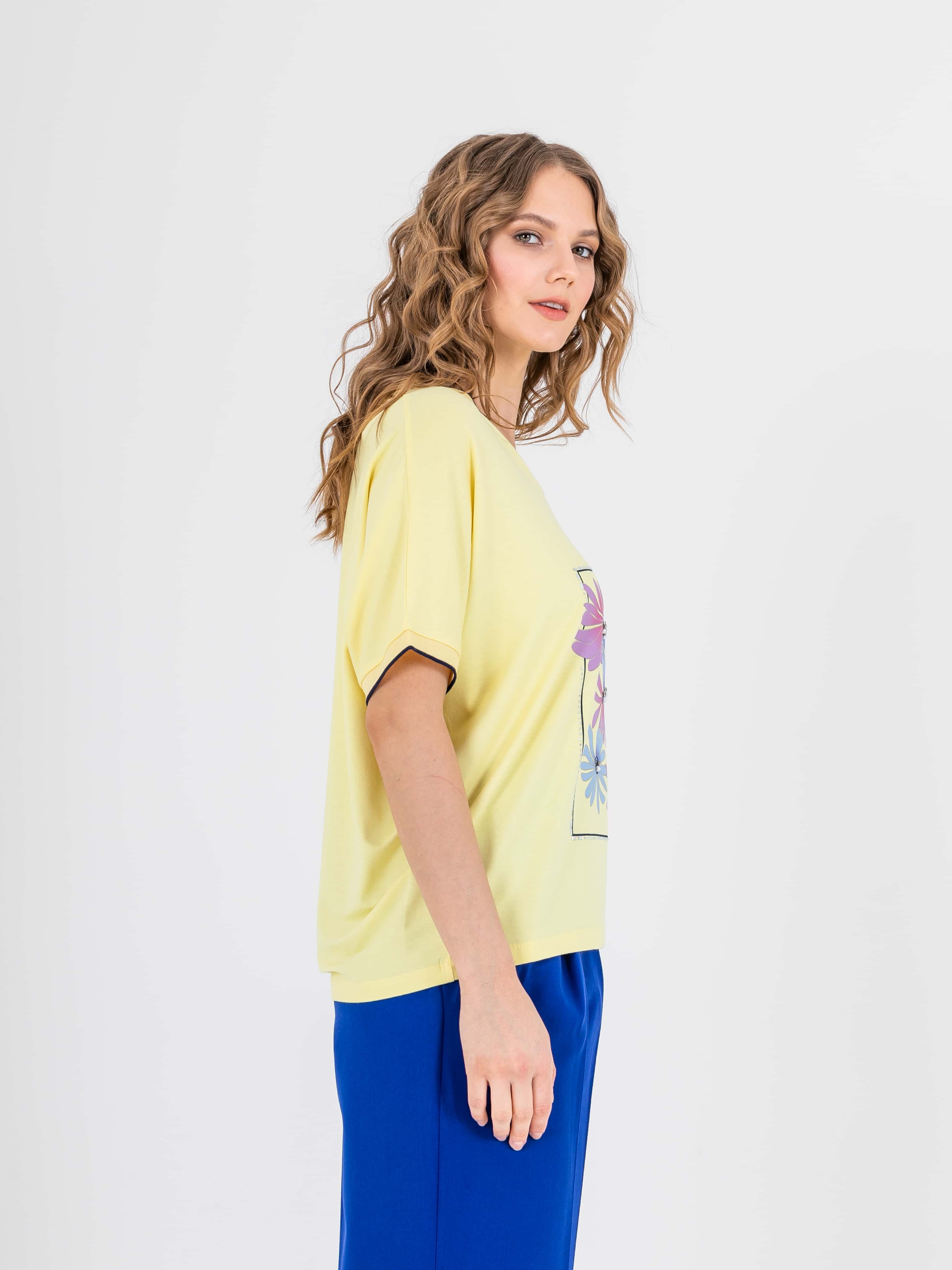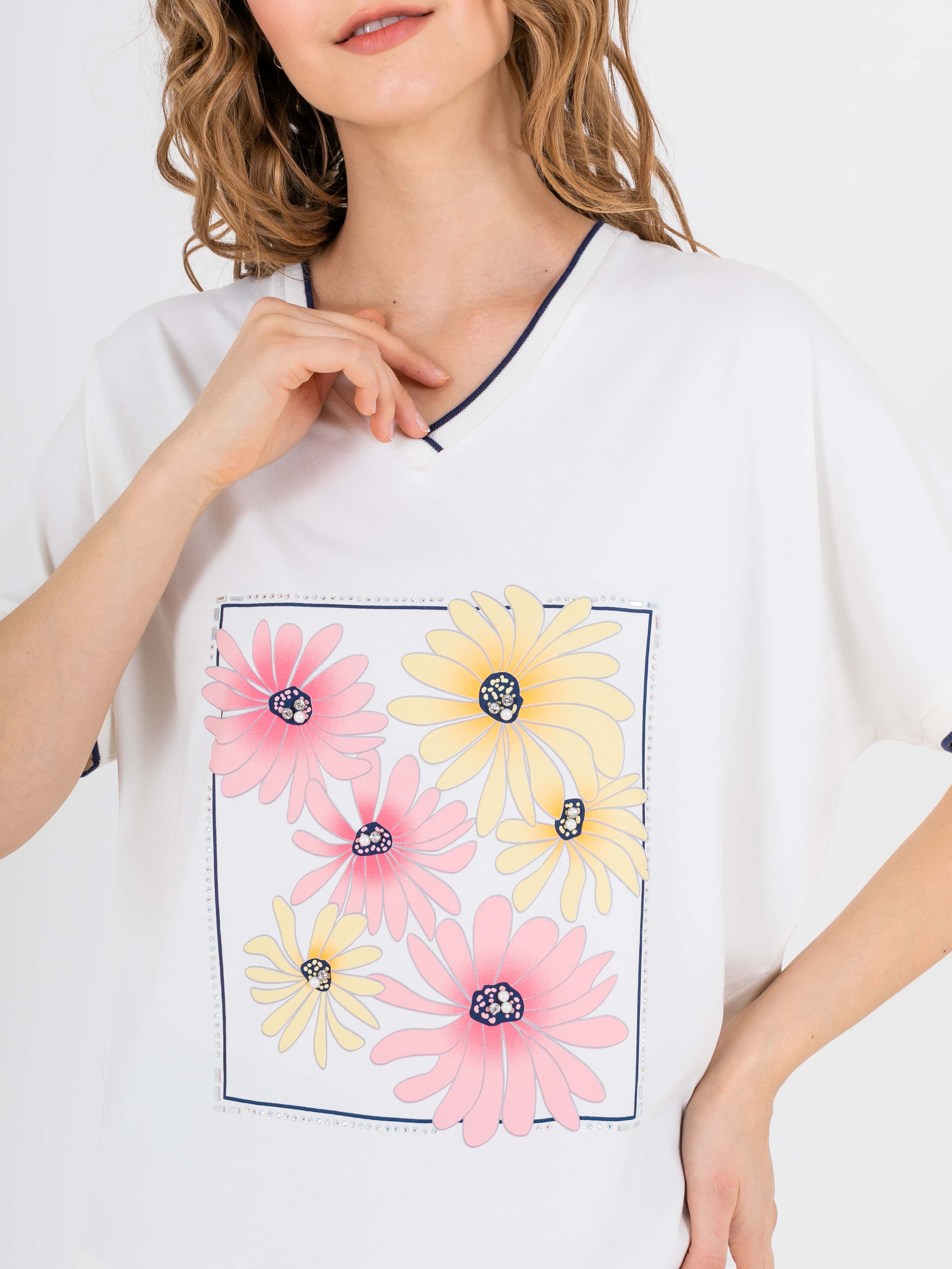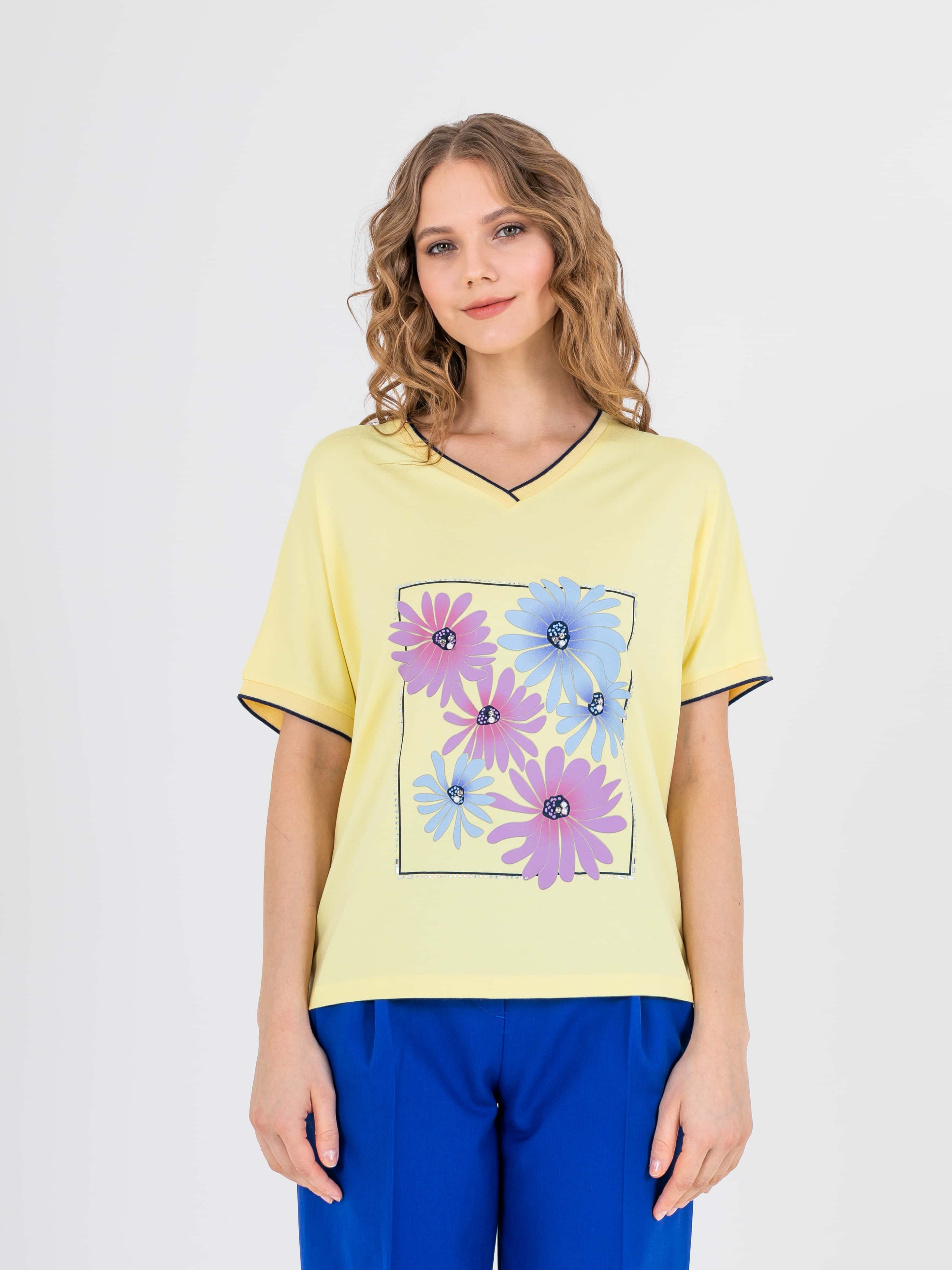 На сайте указаны российские размеры. Оверсайз футболка средней длины прямого силуэта из легкой, мягкой вискозы с добавлением эластана. По переду выполнен яркий принт и аппликация со стразами. Укороченные цельнокроеные рукава с манжетами и контрастным кантом. V-образный вырез горловины, обработанный трикотажной косой бейкой с контрастным кантом.