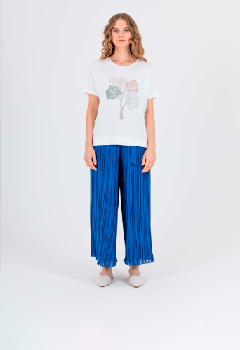 На сайте указаны российские размеры. Футболка средней длины прямого силуэта из легкой, мягкой вискозы с добавлением эластана. Перед и спинка по низу обработаны манжетой с разрезами в боковых швах. По переду выполнена эффектная аппликация со стразами Укороченные цельнокроеные рукава. Круглый вырез горловины с отделочной строчкой.