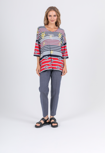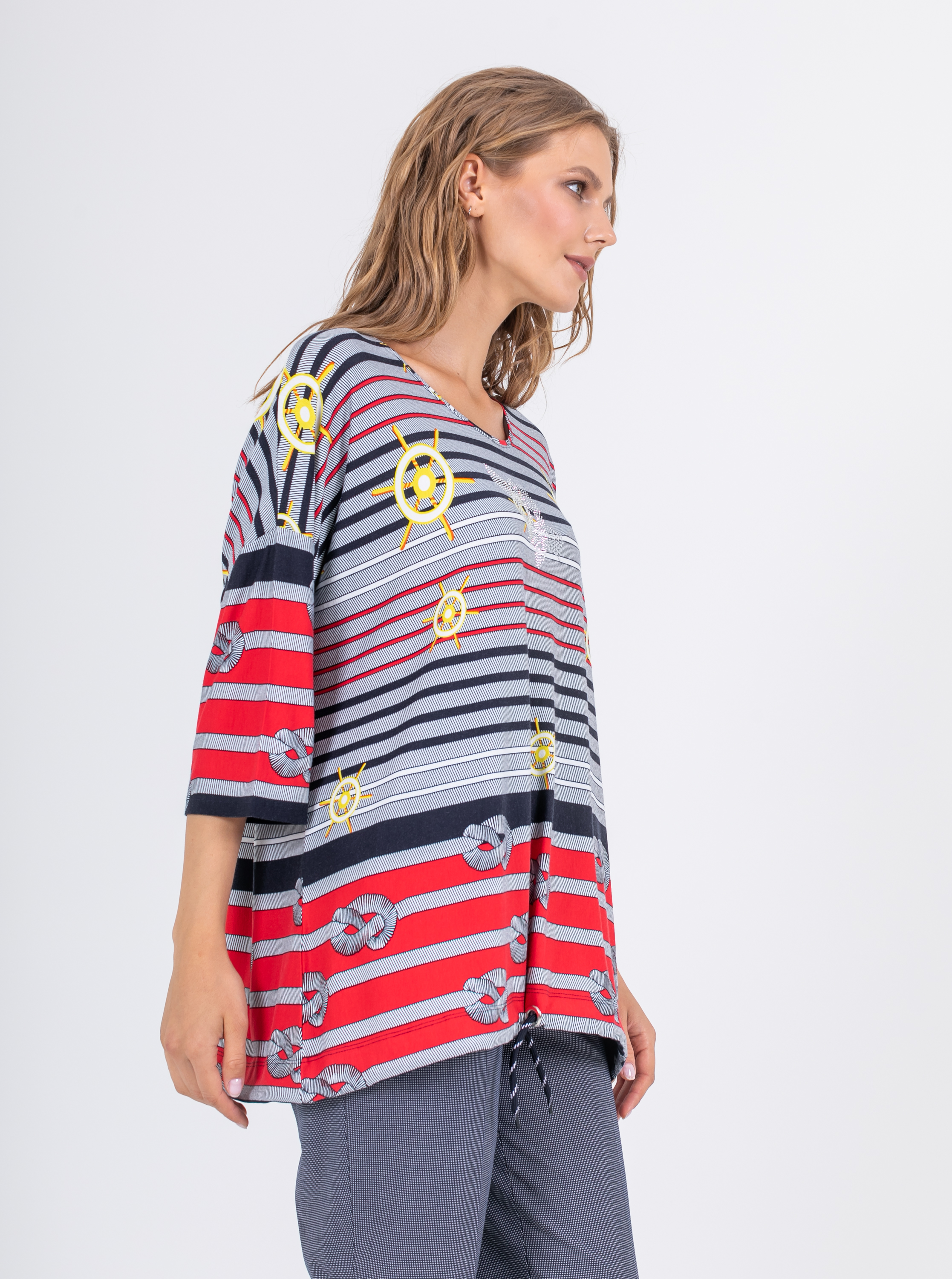Длинная оверсайз футболка прямого силуэта из легкой, мягкой вискозы с добавлением эластана. По переду и спинке выполнен яркий морской принт. Низ обработан кулиской и полосатым шнуром, для регулировки объема. Втачные рукава длиной ¾ со спущенной линией плеча. Круглый вырез горловины.