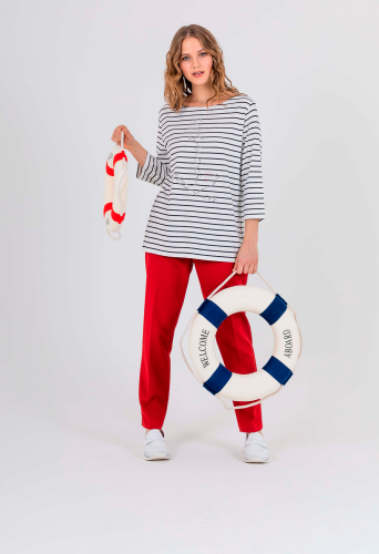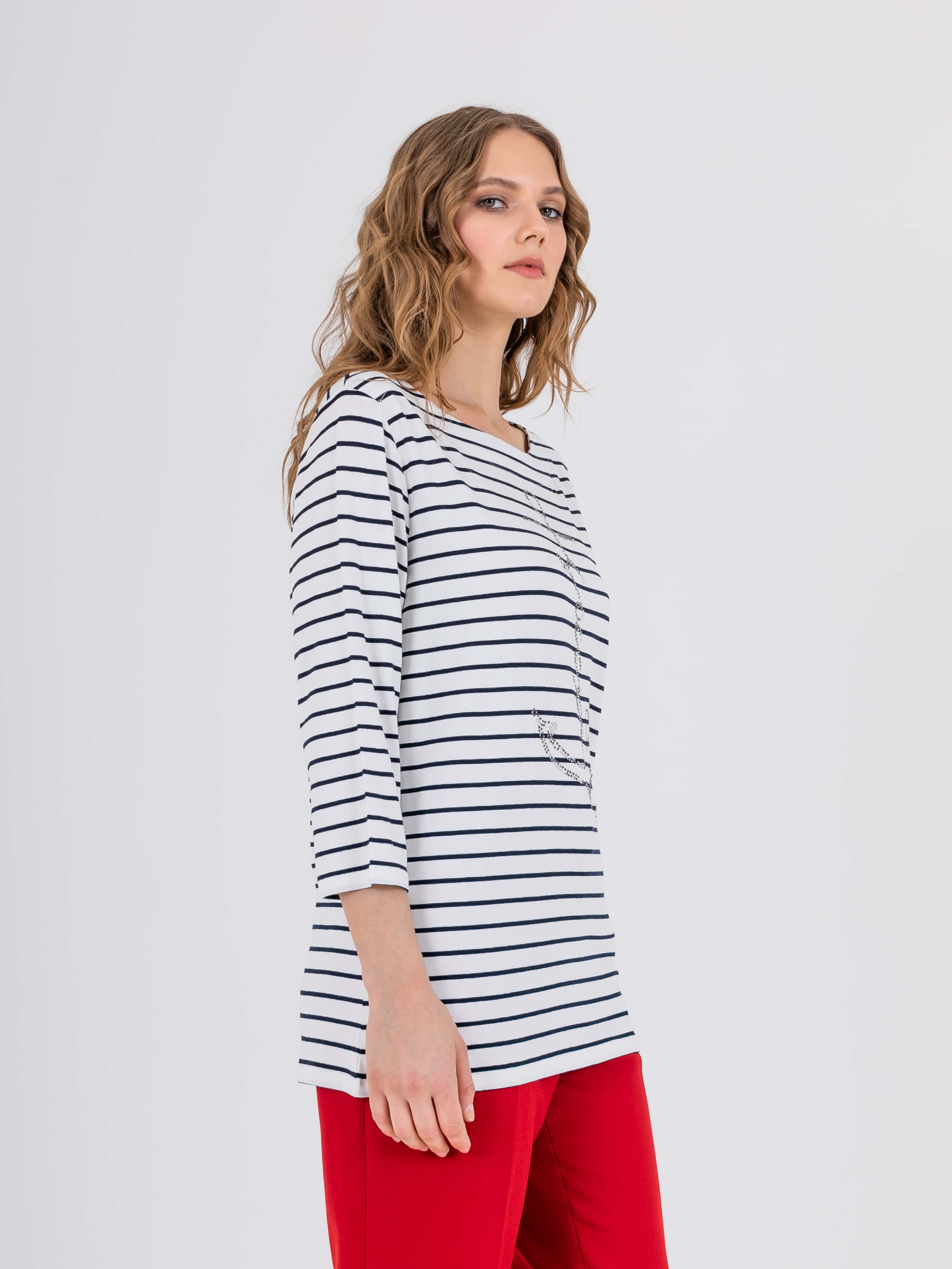На сайте указаны российские размеры. Ткань: изготовлена из высококачественной вискозы (92%) – экологичного материала, хорошо пропускающего воздух и впитывающего излишки влаги, и эластана (8%), придающего ткани упругость. Крой: футболка удлиненная прямого силуэта, закрывающая область паха, может выступать как туника. Универсальности модели добавляет рукав-реглан ¾, который подарит уютное тепло в холода и защитит руки от ярких солнечных лучей на отдыхе. Футболка имеет неглубокий круглый вырез, подчеркивающий красоту шеи. Отделка: классическую футболку-тельняшку украшает рисунок, выложенный из умеренно сияющих страз. Стразы надежно закреплены, выдерживают множество стирок.