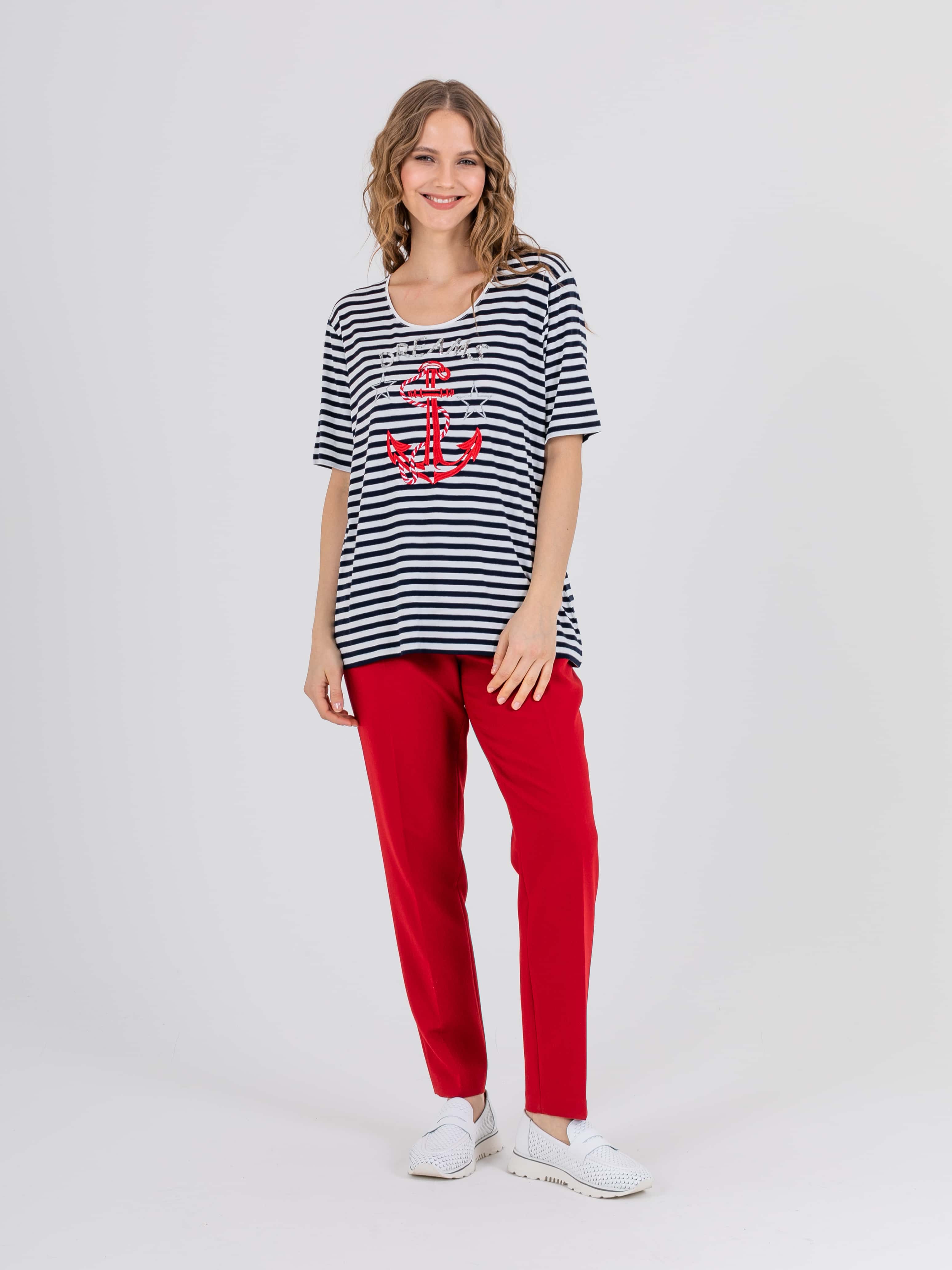 На сайте указаны российские размеры. Ткань: изготовлена из высококачественной вискозы (92%) – экологичного материала, хорошо пропускающего воздух и впитывающего излишки влаги, и эластана (8%), придающего ткани упругость. Крой: классическая футболка-тельняшка с круглым вырезом и свободным коротким рукавом-регланом. Имеет достаточную длину, закрывает область живота, не поднимается вверх при движении и поднятии рук. Футболку можно заправить или носить навыпуск. Отделка: футболку украшает композиция из декоративных элементов: надпись «dream» выполнена из серебристых пайеток, а яркий морской якорь и звезды вышиты атласными нитями.