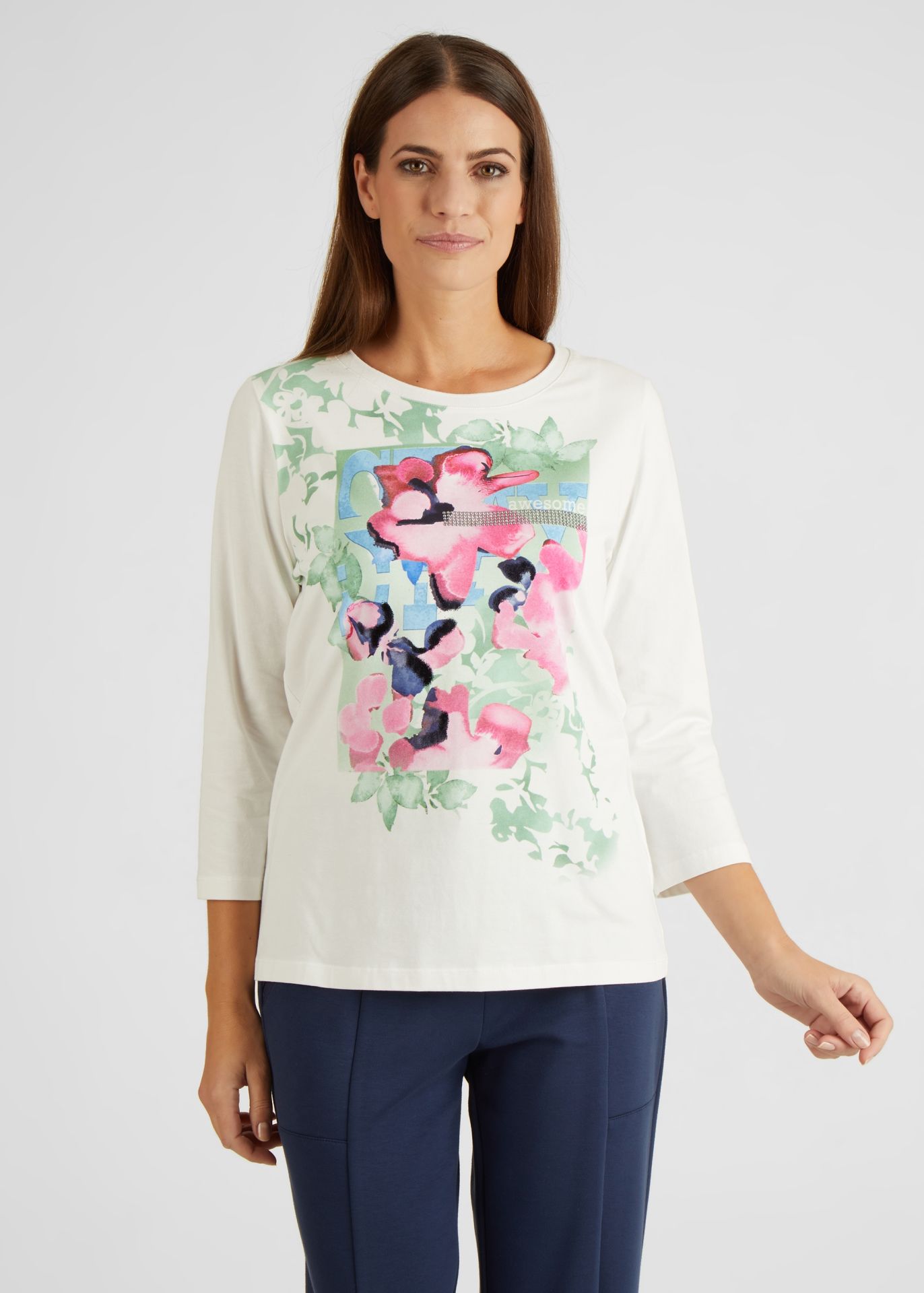 На сайте указаны российские размеры. Однотонная рубашка с рукавами 3/4 и очаровательным принтом спереди и аппликацией из страз привлекает внимание. Качество мягкого трикотажа и хлопка гарантирует удобную посадку. Сочетайте эту рубашку с джинсами или небрежно с спортивными брюками. Рост модели 176 см. Длина по спинке от плеча для размера 46: 64 см.