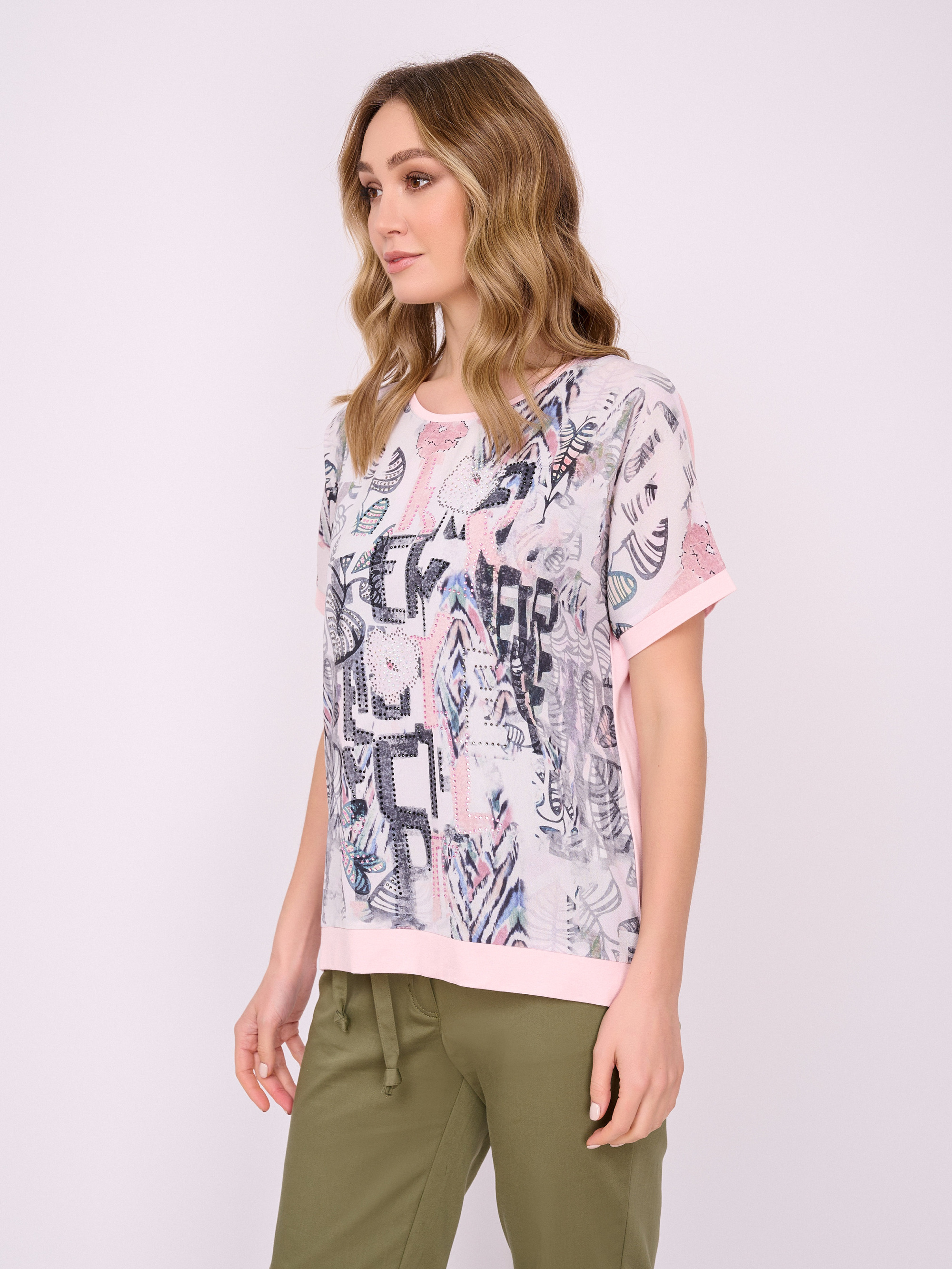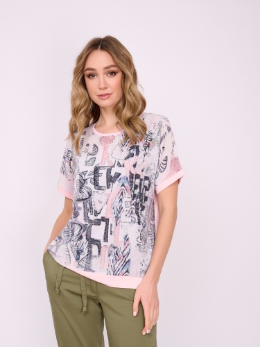 На сайте указаны российские размеры. Трикотажная прямая бледно-розовая футболка с круглым вырезом, с коротким рукавом, с цветочным рисунком и стразами. Длина по спинке: 60 см. Рост модели: 175 см.