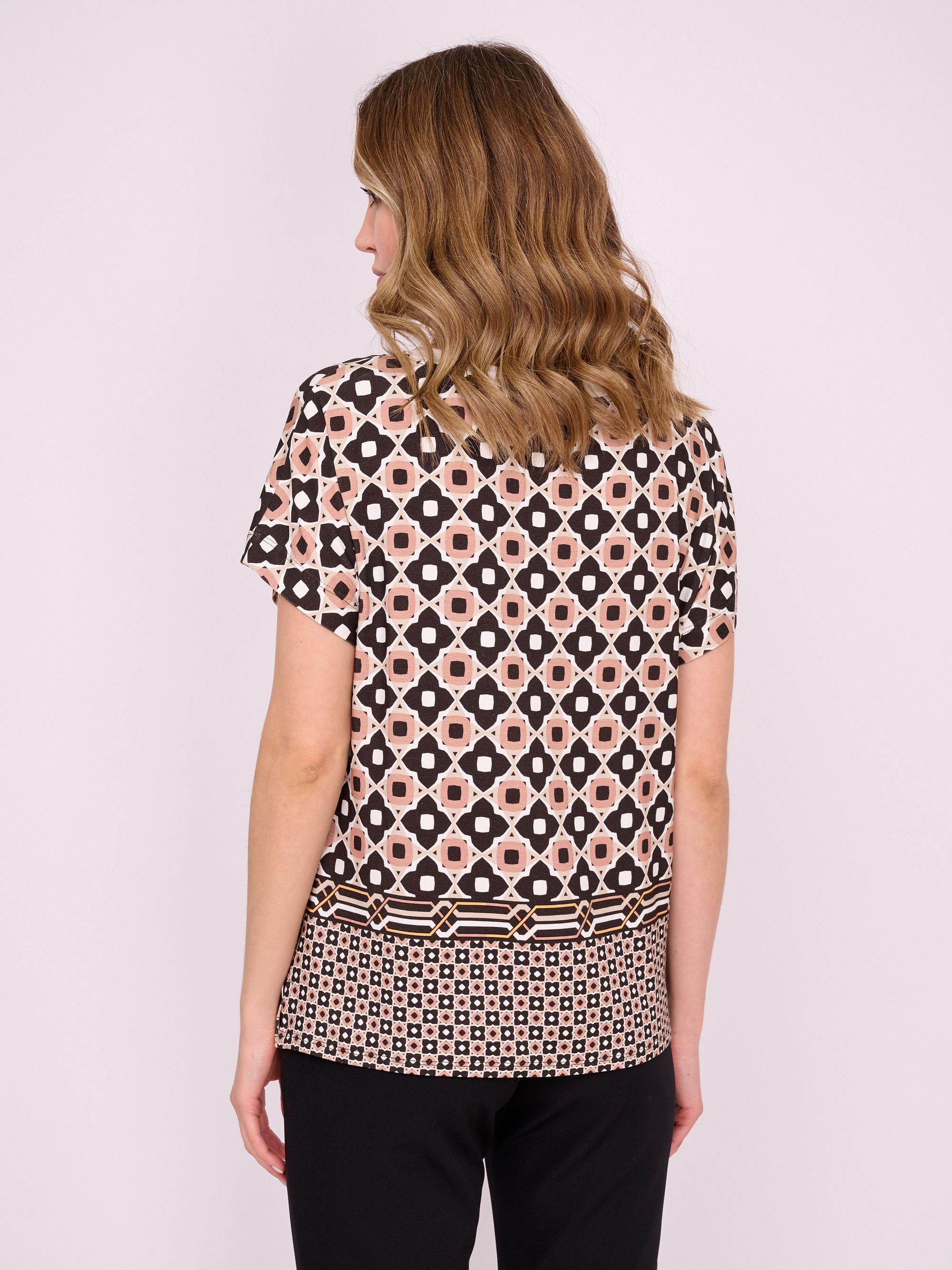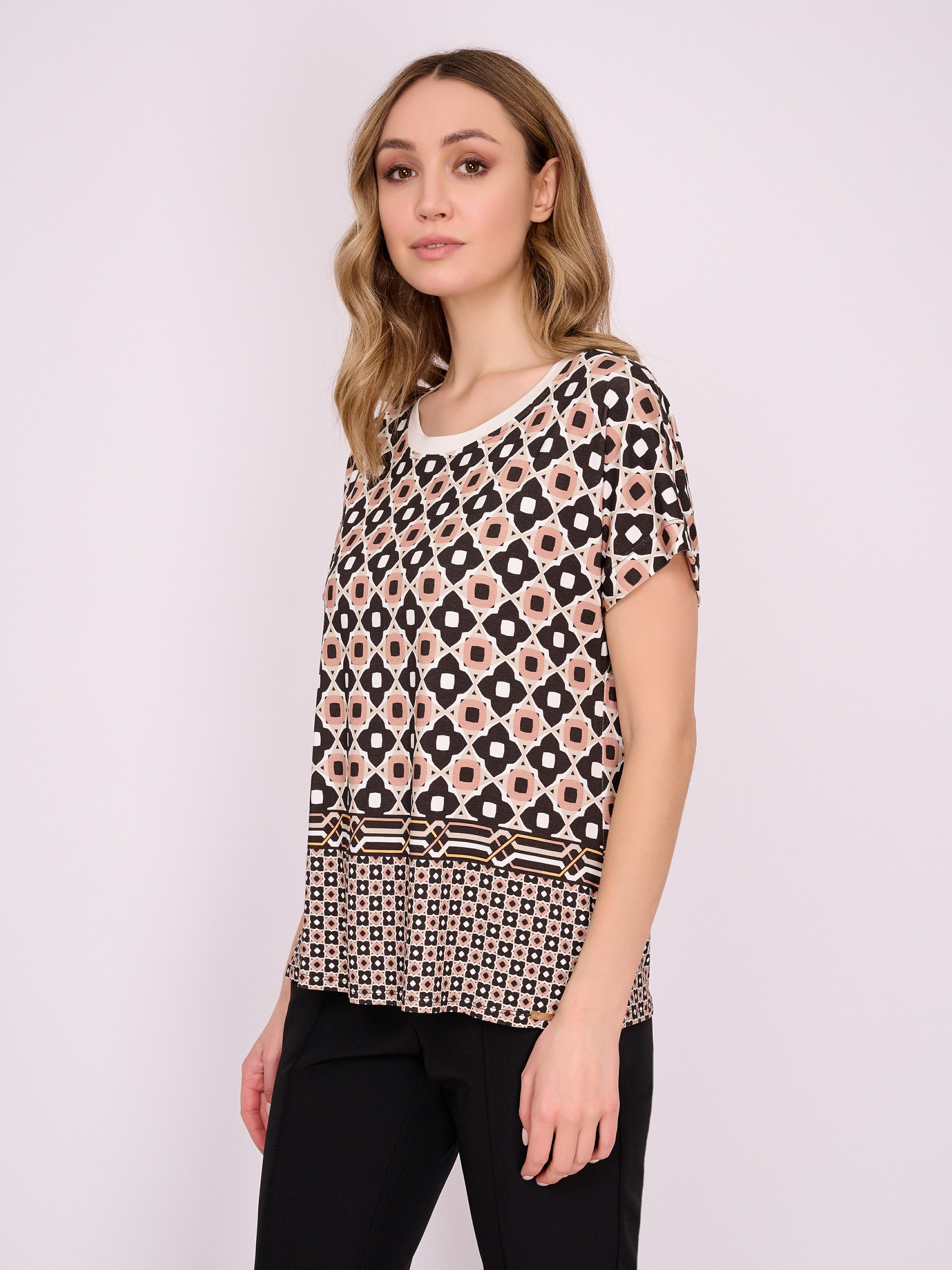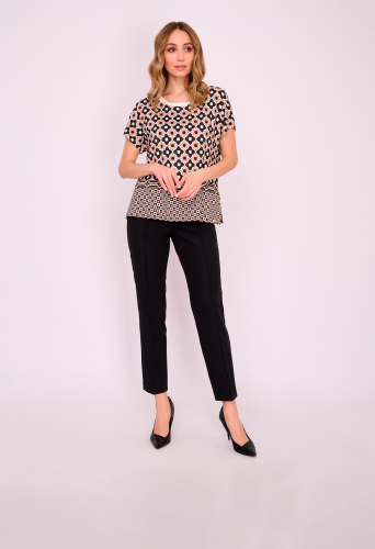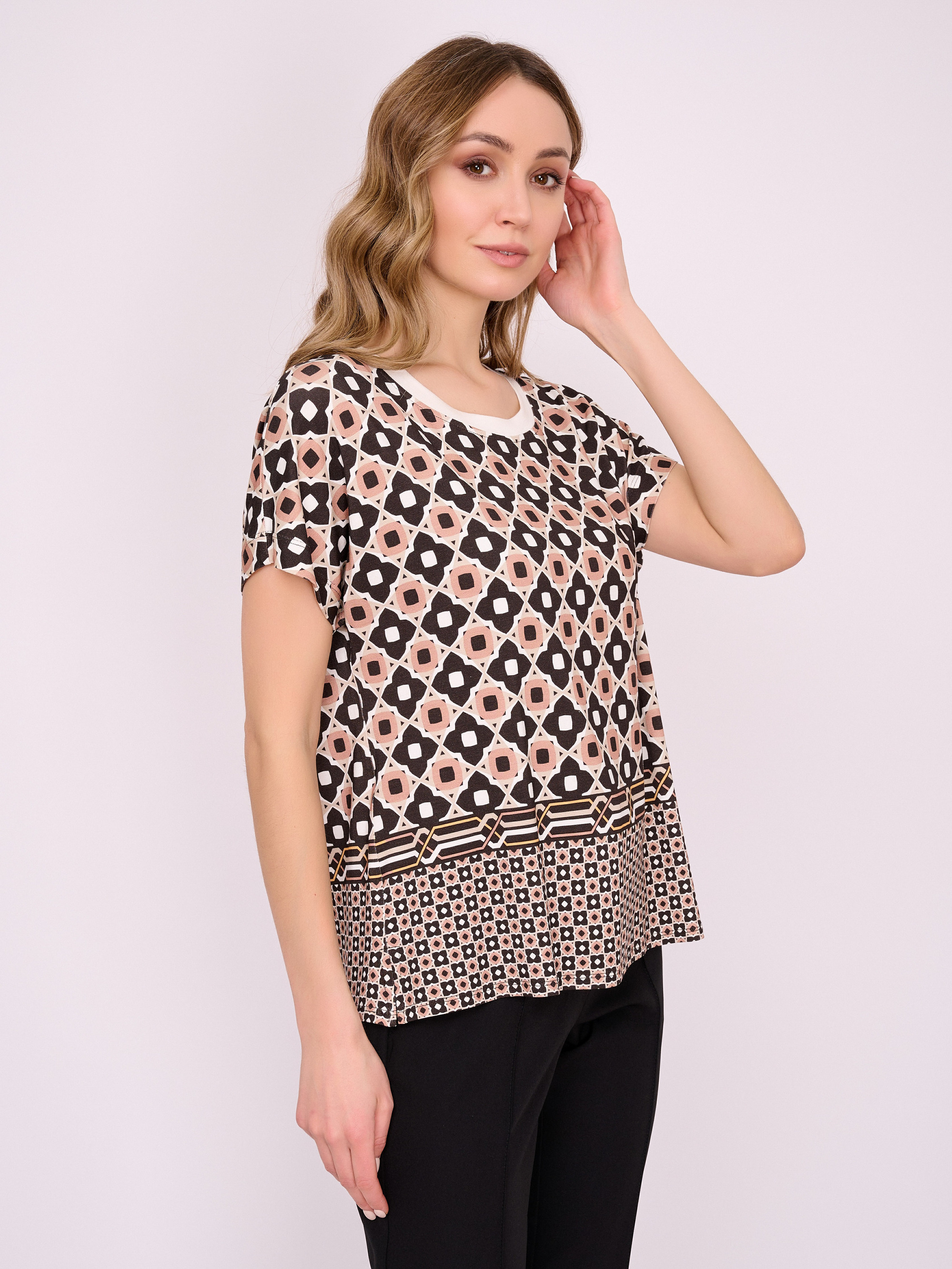 На сайте указаны российские размеры. Трикотажный джемпер свободного покроя с короткими цельнокроеными рукавами и боковыми разрезами. Длина по спинке: 49 см. Рост модели 175 см.