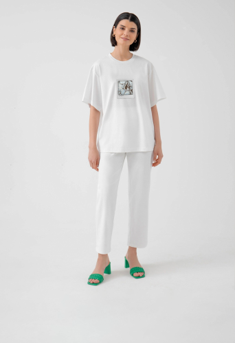 На сайте указаны российские размеры. Базовая женская футболка свободного кроя белого цвета с принтом, короткими рукавами и круглой горловиной. Благодаря мерсеризации данная футболка имеет: - повышенную прочность и гигроскопичность - глубокий цвет - особенный блеск и гладкость - однородность волокон нити и высокое качество ткани. Рост модели 175 см.